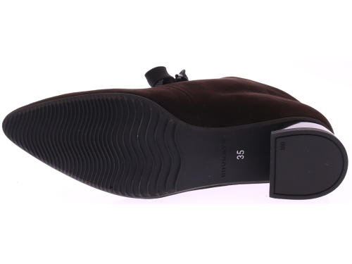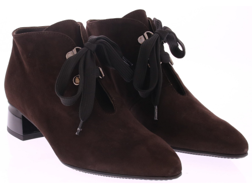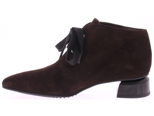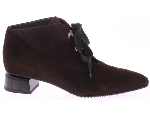 Dark brown suede women's lace-up boot from Brunate. This ankle boot features a beautifully shaped 3cm mid-heel, a ribbon lace closure, and Brunate's signature comfortable fit. The beautifully soft calf suede creates a luxurious and soft feel. This boot pairs beautifully with dresses, skirts, and trousers.