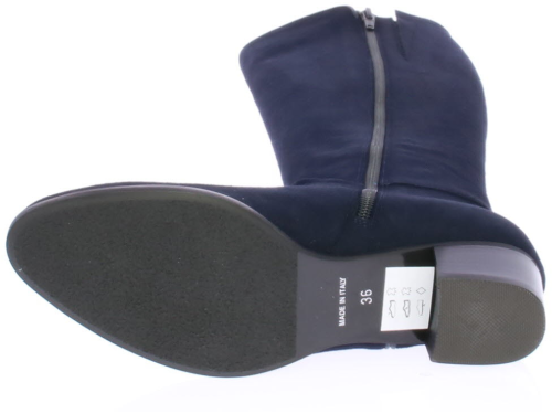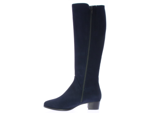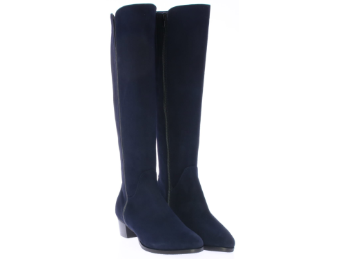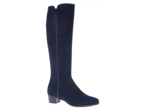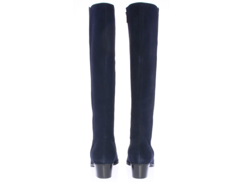 Dark blue suede women's boot from Nalini. The boot has an XS shaft, meaning it's suitable for a narrower calf. This tall boot is finished with a leather trim along the entire shaft. The heel is 3 cm, and the shaft is slightly higher at the front than at the back.