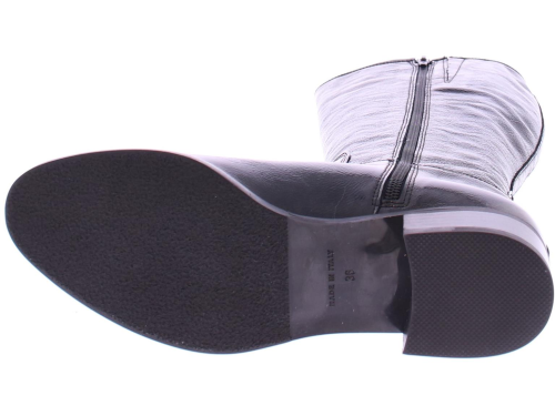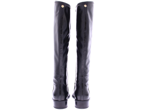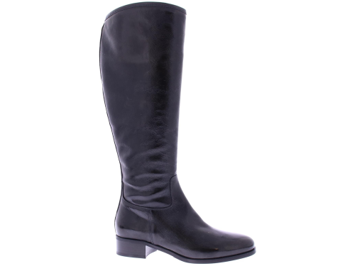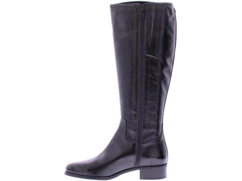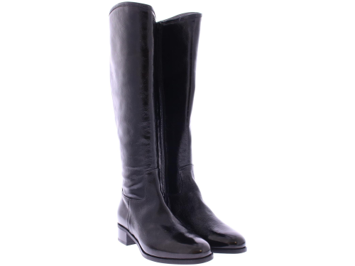 Black patent leather long women's boot by Nalini. Made with a regular shaft width on an oval last with a 2 cm heel. There is a zipper on the inside. And they are completely lined with leather.