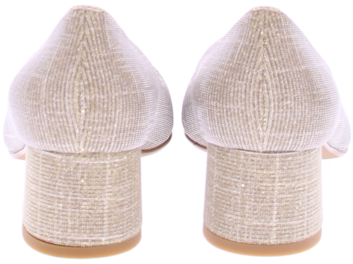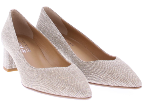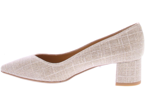 Gold Platinum fabric women's pump by the brand Nalini. The covered, comfortable heel has a height of 5 cm. The V-cutout gives the pump an elegant look.