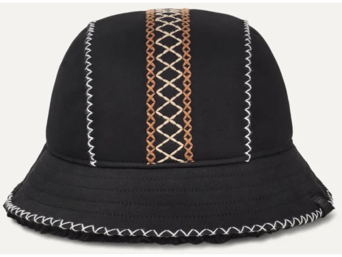 Black women's fisherman's hat by Ugg. This wonderfully warm fisherman's hat is lined with genuine sheepskin. Is hand-embroidered and has a leather Ugg plate on the side.