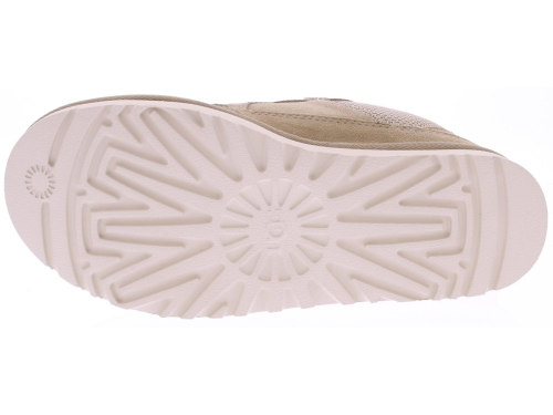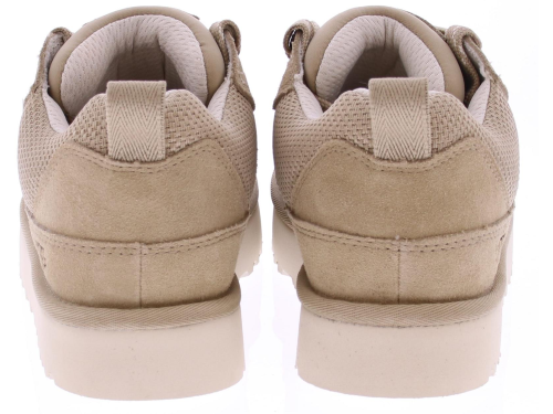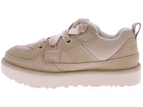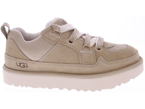 Beige suede men's sneaker/boot from Ugg. The Lowmel Mustard Seed is a low-top sneaker with sturdy, wide laces and a fabric lining. The upper is mostly suede, with a mesh upper. The Ugg logo is printed on the side of the heel.