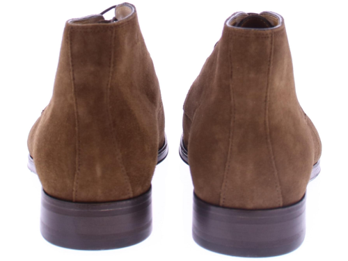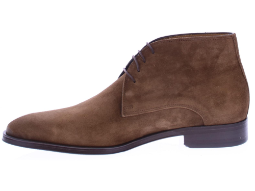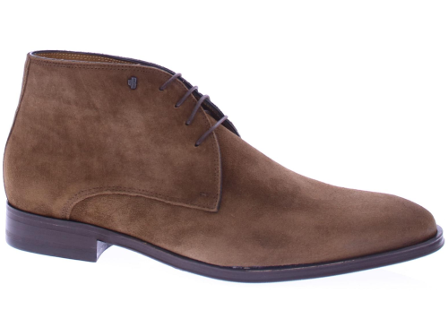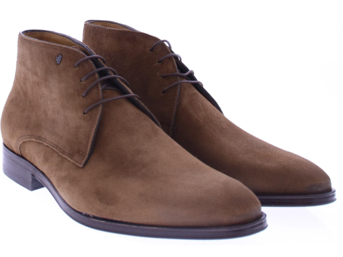 Cognac suede men's lace-up boot by Van Bommel, model SBM-50029-23-01. The upper is made of high-quality suede with a metal Van Bommel tag on the shaft. The graceful lace-up closure with fine round laces gives this shoe a stylish look.