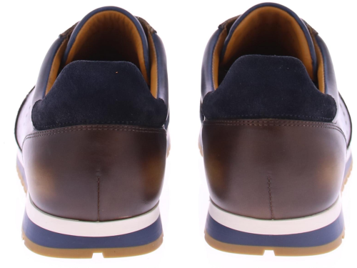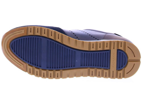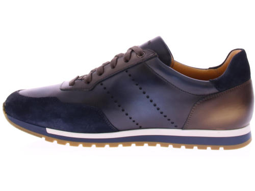 Magnanni heren sneaker in donker blauw leer met suede. De schoen heeft als accentkleuren een cognac leren hiel en een donker bruin leren veter stuk. Hierdoor is de schoen makkelijk te combineren met vele kleuren kleding. De zool is van rubber en de voering van leer. Het suède materiaal aan de buitenkant en het leer aan de binnenkant zorgen voor een luxe uitstraling en een zacht gevoel aan de voeten.