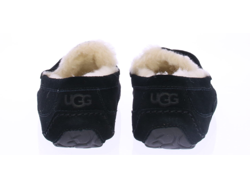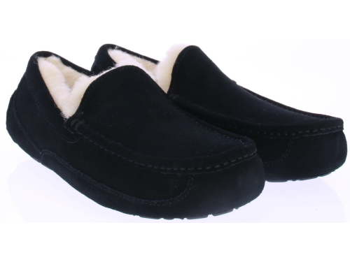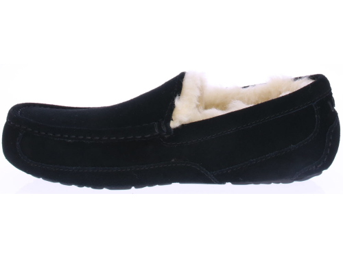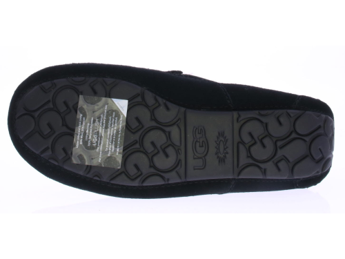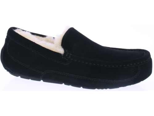 Zwart suede heren pantoffel van Ugg. De artikel naam van deze pantoffel is 'Ascot Black'. De pantoffel is gevoerd met schapenvacht wat de eigen lichaamstemperatuur behoud. De zool is van rubber.