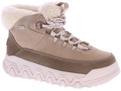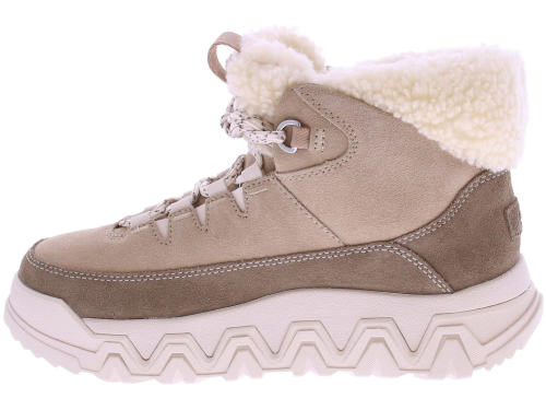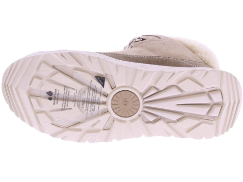 Zandkleurig suede dames enkelboot van Ugg. De TerreTrail Cozy Lace is comfortabel en functioneel. De laars is ontworpen met waterdicht suède en een kraag van krullend imitatiefleece van gerecyclede vezels, voor een tijdloze winterstijl. Hul jezelf in warmte met de zachte voering van imitatiefleece en onze behaaglijke UGGplush-inlegzool. De TerreTrail Cozy Lace is opgewassen tegen het winterweer met een Spider Rubber®-buitenzool voor verbeterde grip
