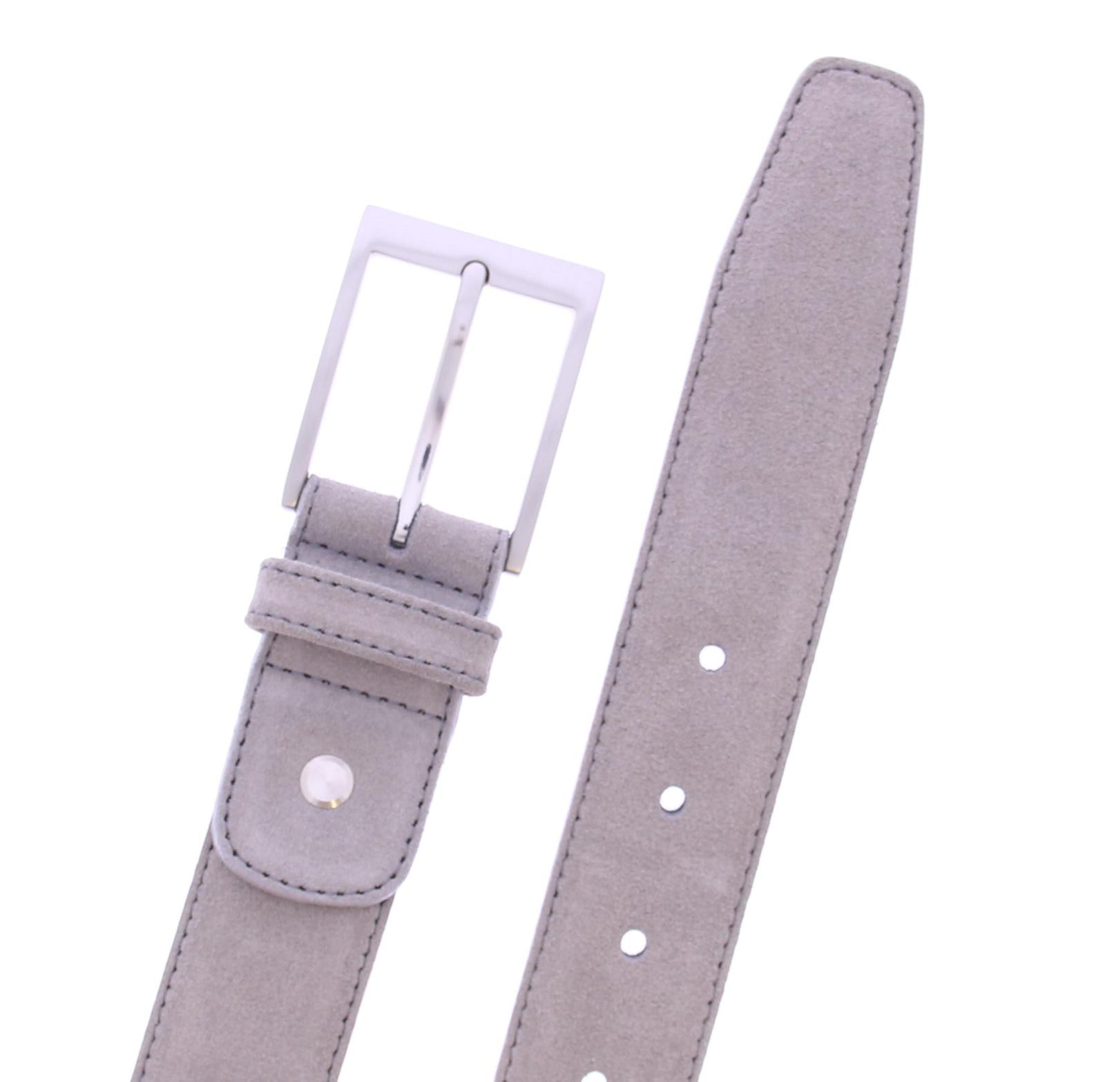 Gray suede belt. The belt is 3.5 cm wide, has a leather lining, and can be shortened at the buckle.