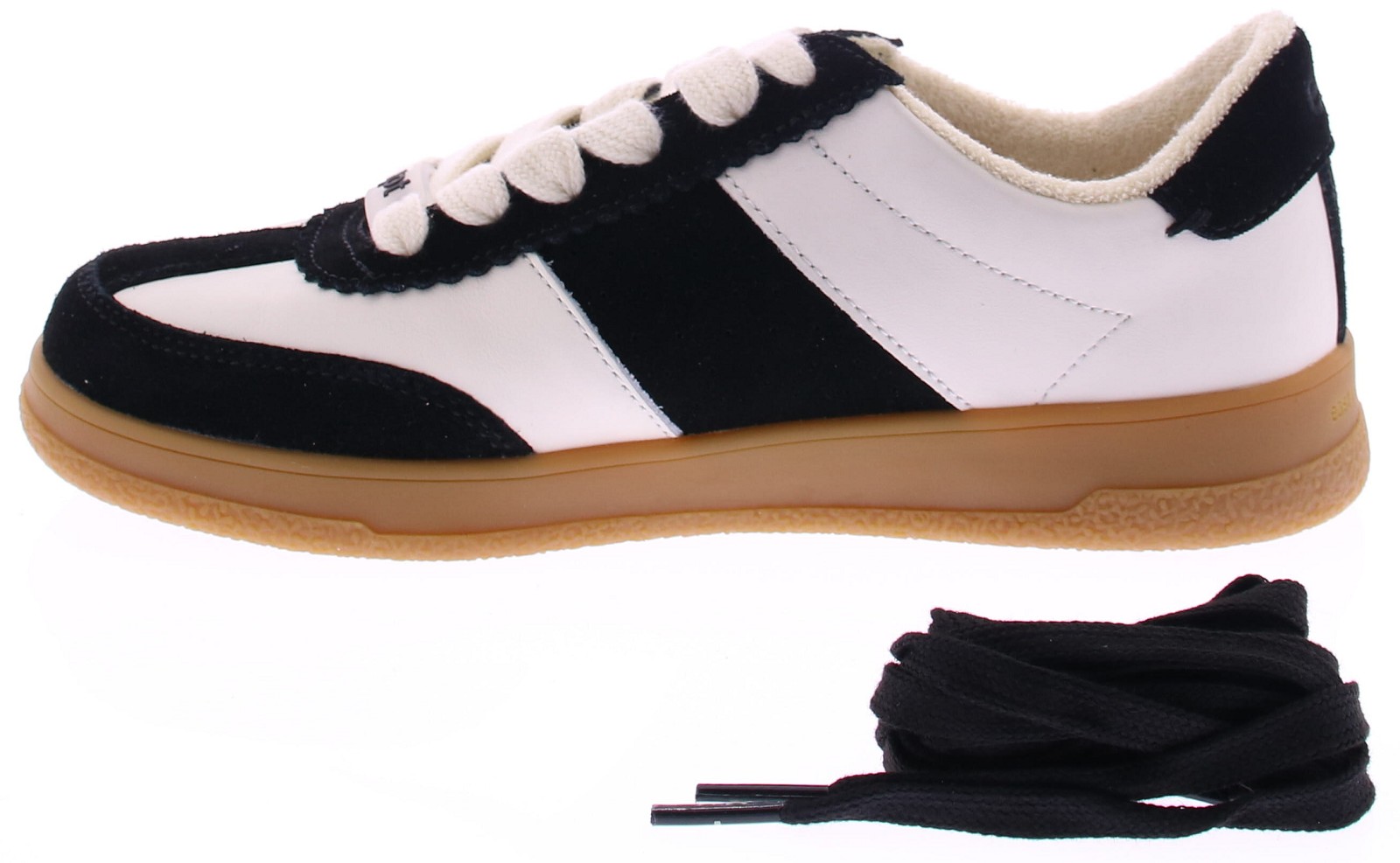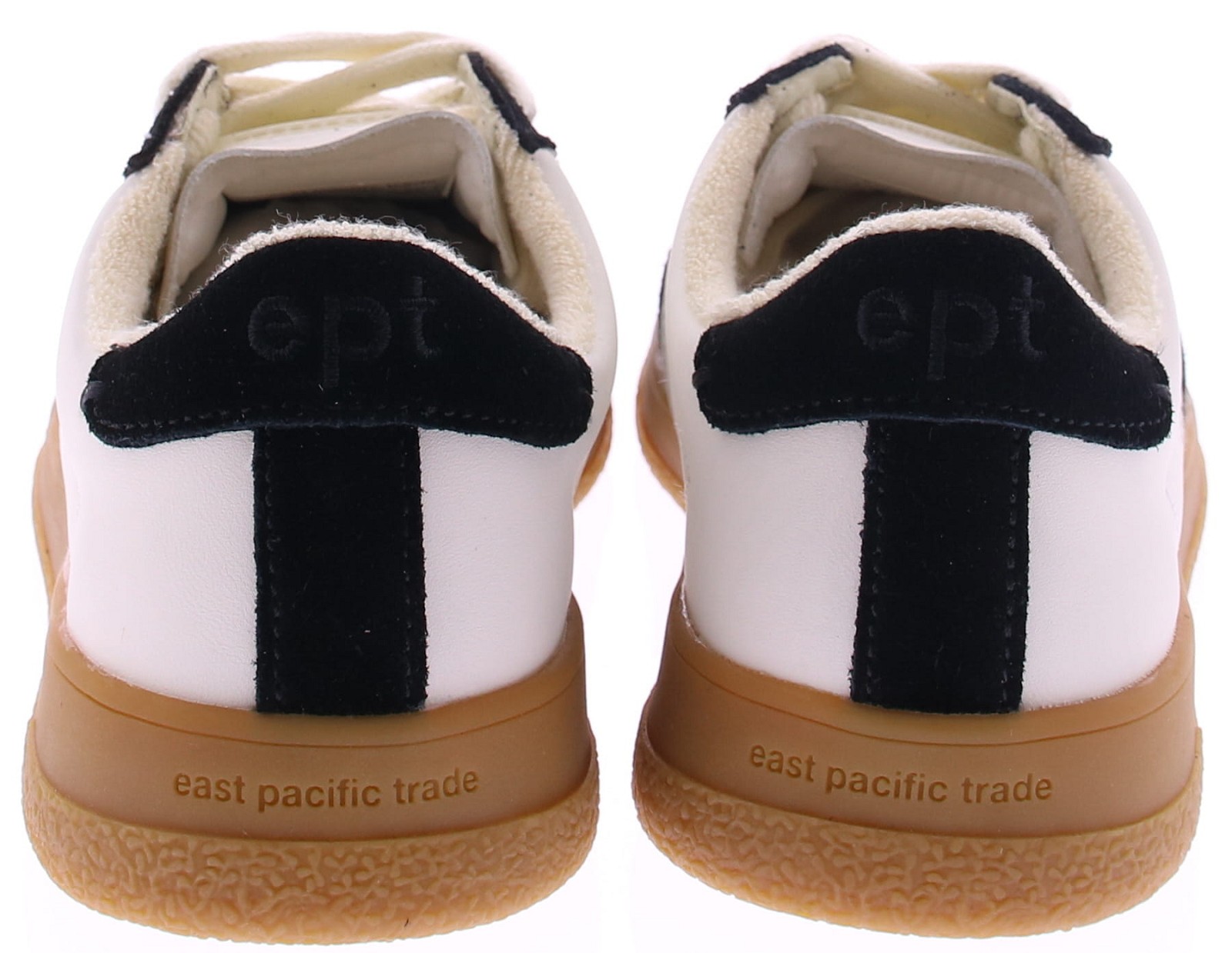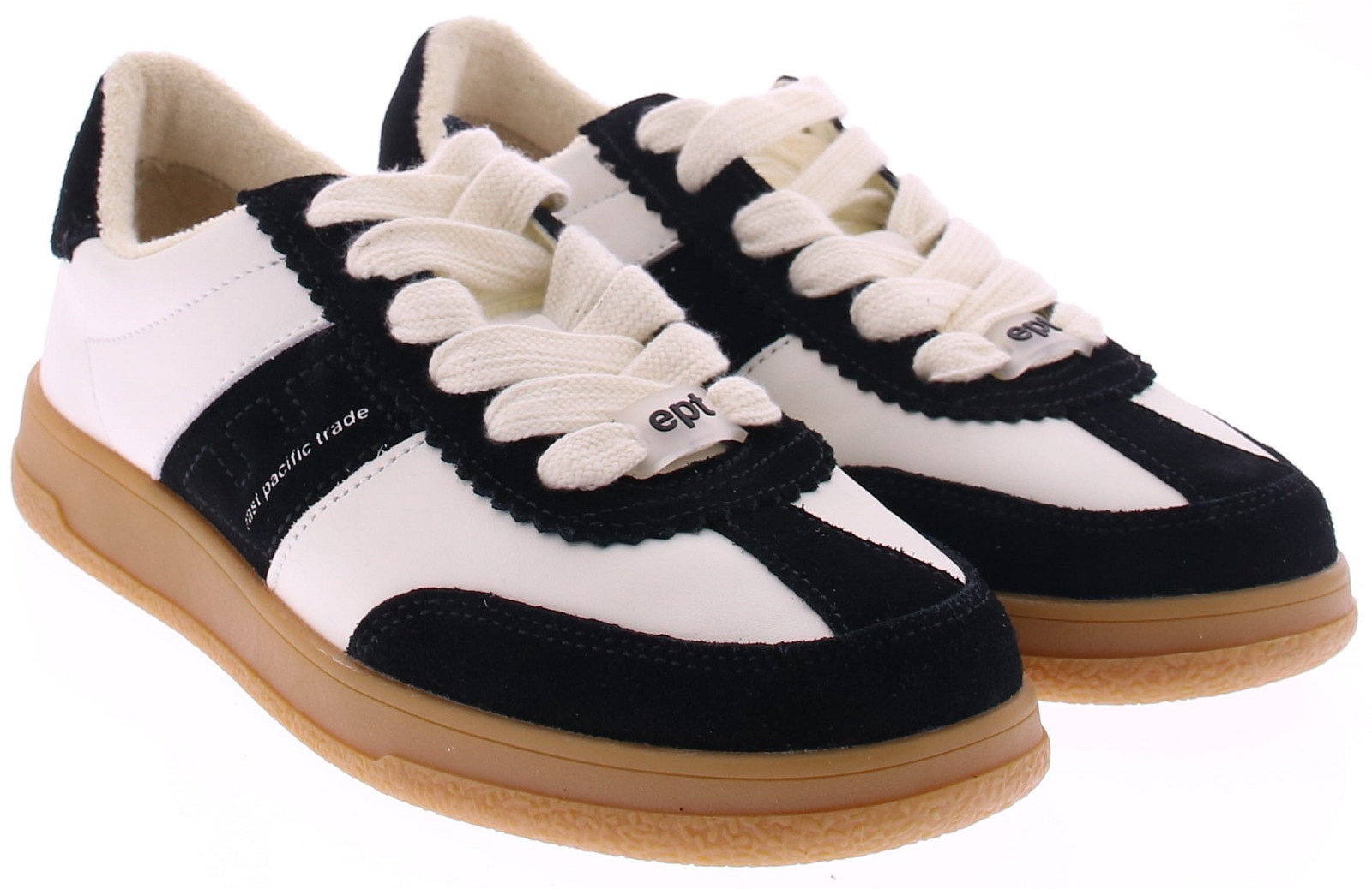 White leather and black suede women's sneakers from EPT. These sneakers are crafted from a combination of supple white leather and black suede. The rubber sole provides excellent grip and a sporty touch. A versatile sneaker that pairs effortlessly with both jeans and summer pants. Runs small. Discover other sneakers at Klijsen.