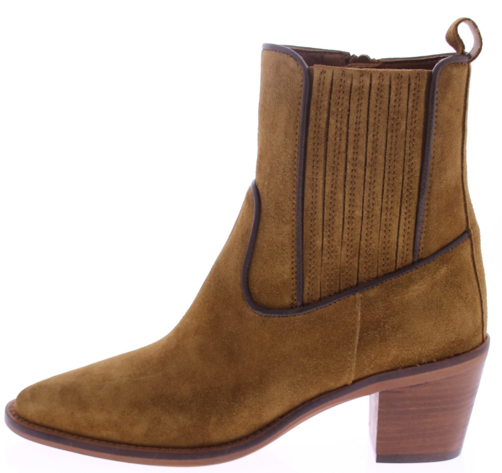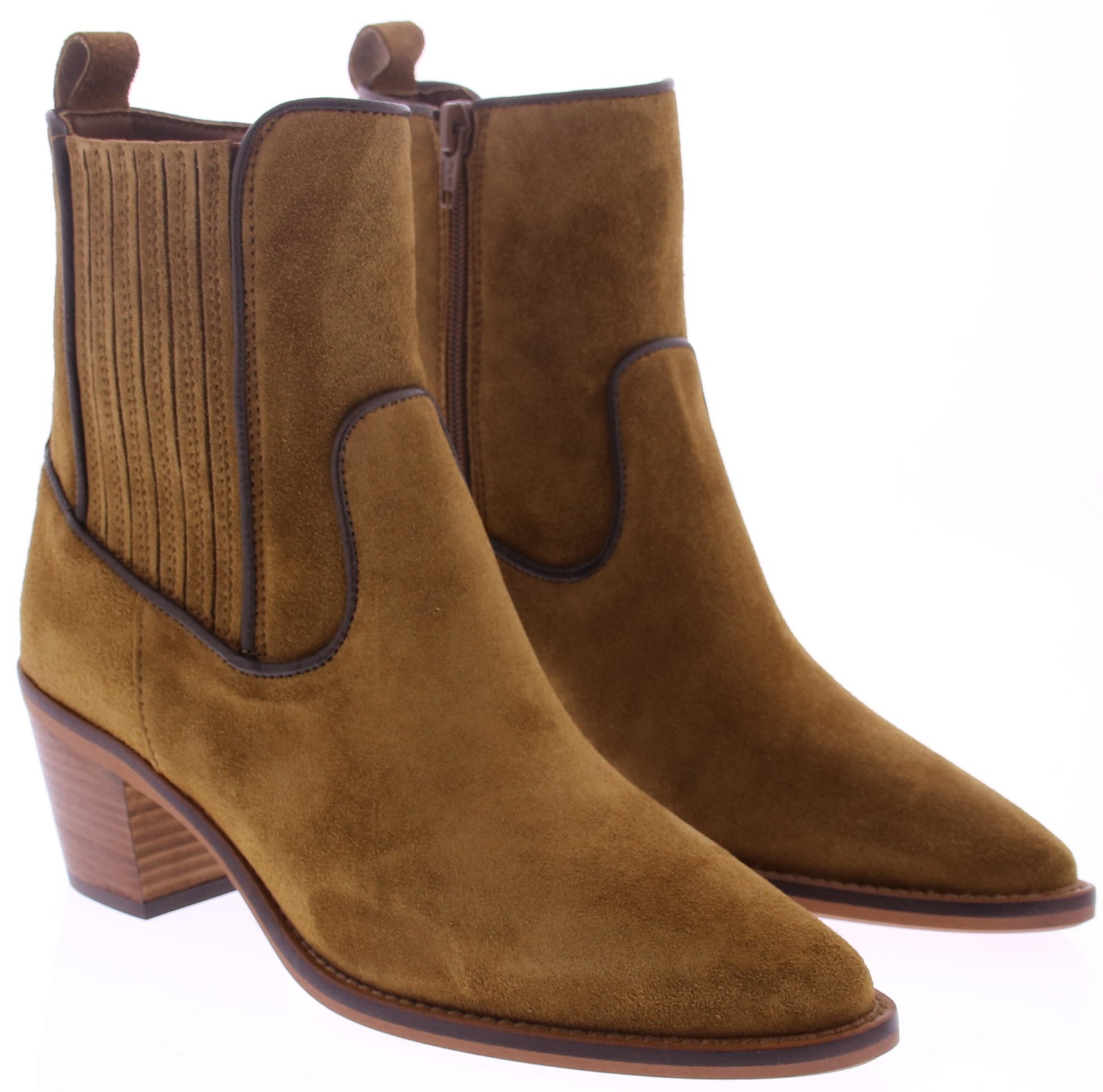 Cognac suede women's short boot from Alpe. This Western-style boot from the Spanish brand Alpe is made of suede. The covered elastic insert and zipper ensure a comfortable fit, while the pull tab makes it easy to put on and take off. The sturdy 6cm heel with a wood effect gives the boot a robust touch with a feminine twist. The dark brown leather piping completes the look with a subtle, stylish finish.