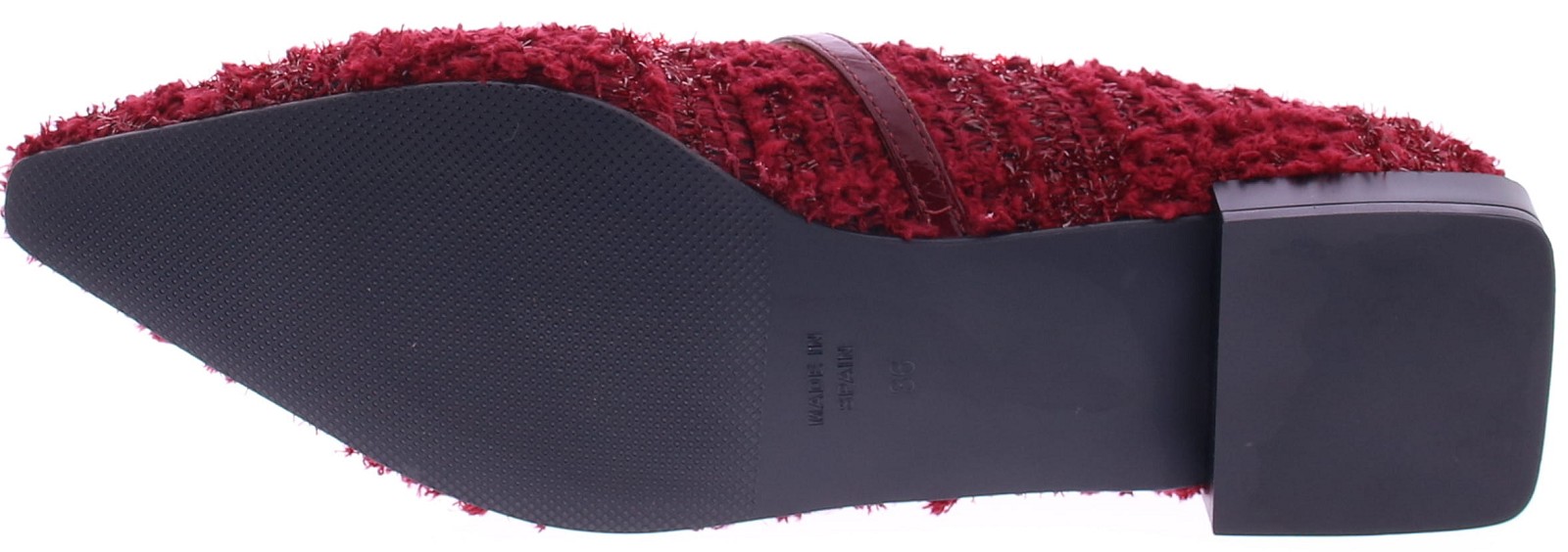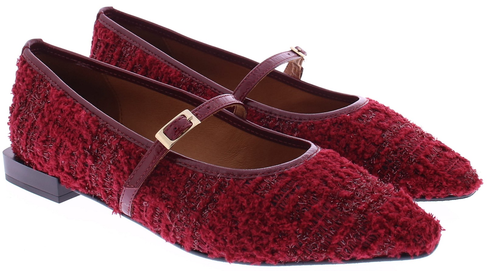 Angel Alcron women's ballerina pump in burgundy tweed. This elegant pump is crafted from burgundy tweed and features a slightly pointed toe. A striking detail is the narrow strap across the instep. The pump sits on a stylish 2 cm block heel. The lining is full leather, and the rubber sole provides extra grip. A fashionable and comfortable choice for any occasion.