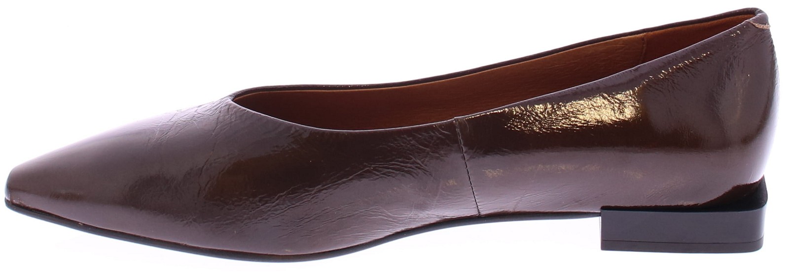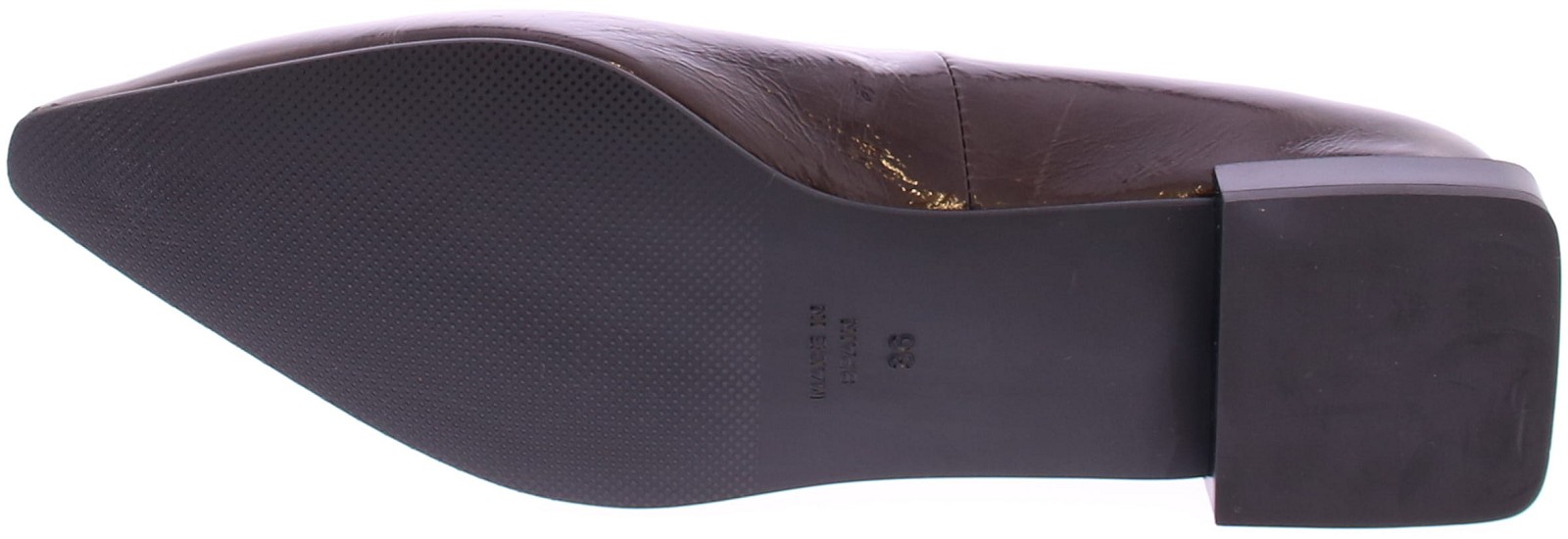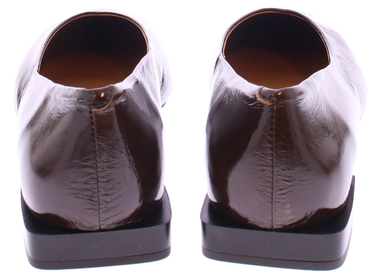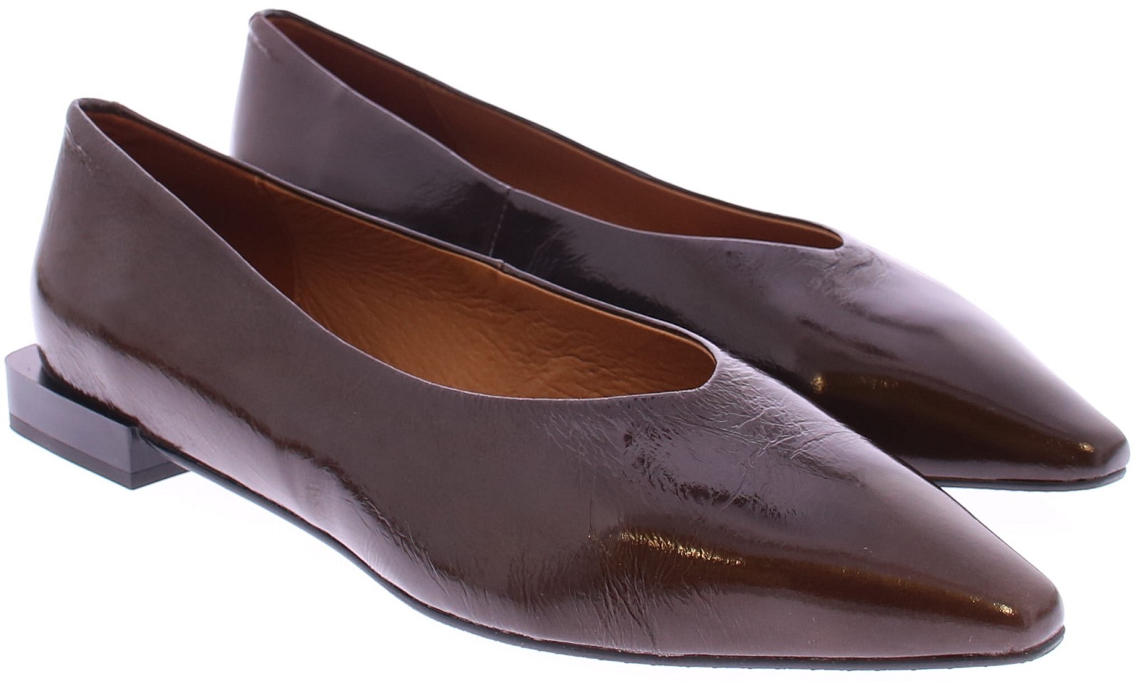 Dark brown patent leather women's ballerina flats from Angel Alcron. This elegant women's pump is made of patent leather and has a slightly pointed toe. The pump sits on a stylish 2 cm block heel. The lining is full leather, and the rubber sole provides extra grip. A fashionable and comfortable choice for any occasion.
