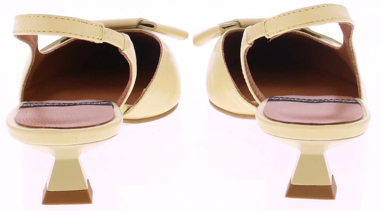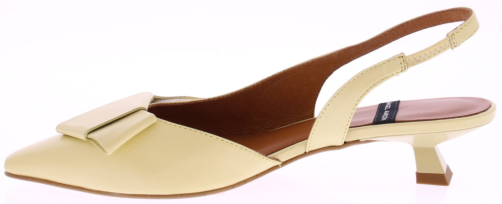 Yellow leather slingback pumps by Angel Alarcón. These women's pumps feature a pointed toe and a button detail on the instep. The 3cm kitten heel provides a comfortable height. Thanks to the elastic in the heel, the shoe fits snugly and is comfortable to wear. An elegant style that looks great under a dress or skirt, but also pairs well with trousers. Discover other women's pumps by Angel Alarcón at Klijsen.