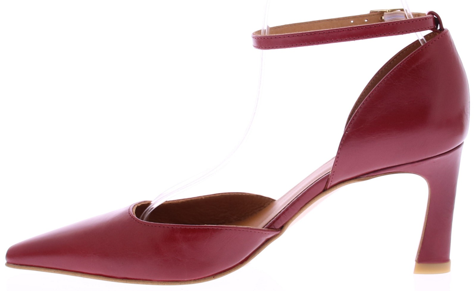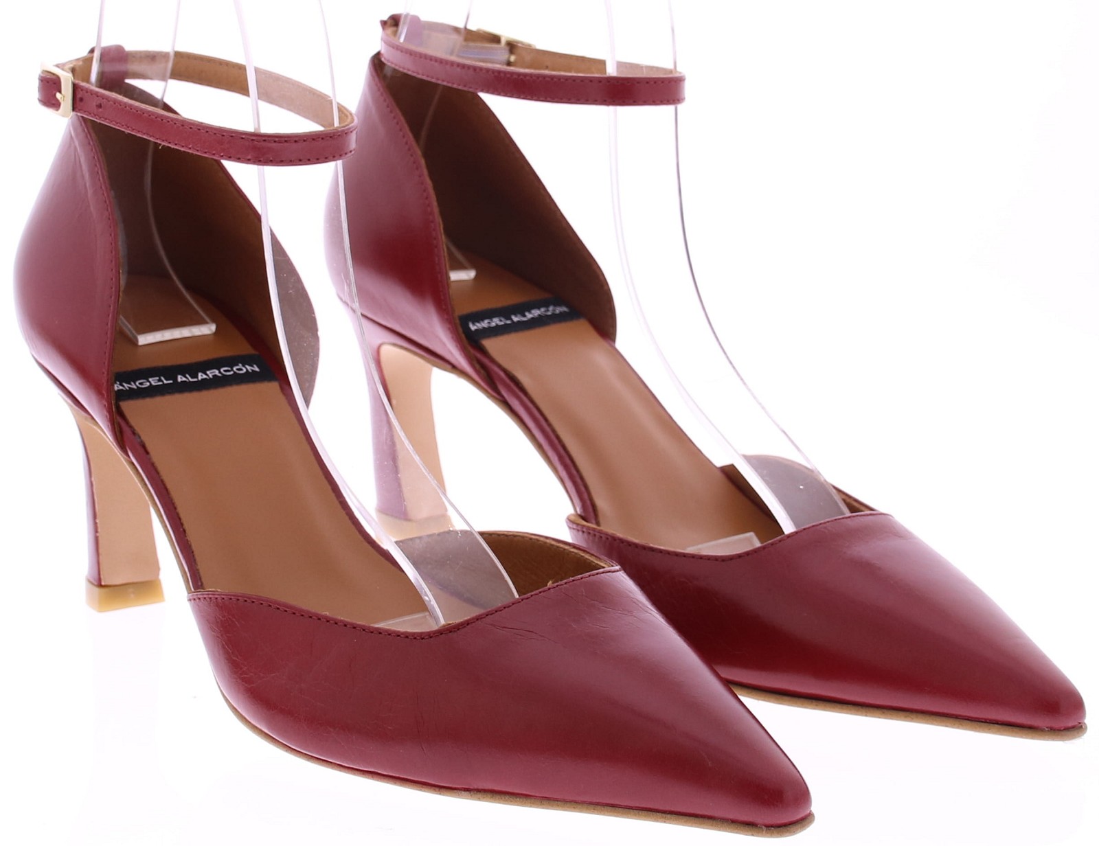 Red leather women's pumps by Angel Alarcón. These pumps are crafted from leather with a subtle sheen and feature a pointed toe. The heel is 7 cm high, and the adjustable ankle strap with a silver buckle provides a snug fit and extra support. Perfect with a dress or skirt. Discover other women's pumps by Angel Alarcón at Klijsen.