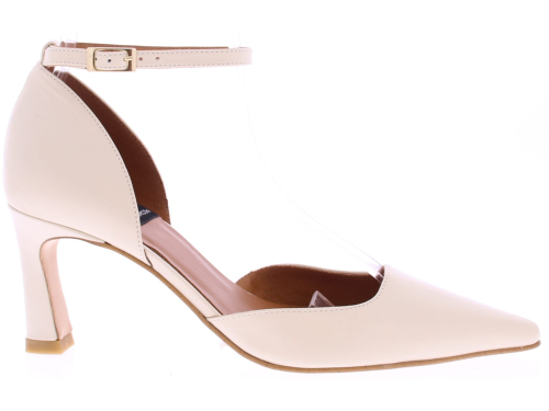 Cream-colored leather women's pumps by Angel Alarcón. These pumps are crafted from leather with a subtle sheen and feature a pointed toe. The 7 cm heel height and the adjustable ankle strap with a silver buckle provide a snug fit and extra support. Perfect with a dress or skirt. Discover other Angel Alarcón women's pumps at Klijsen.