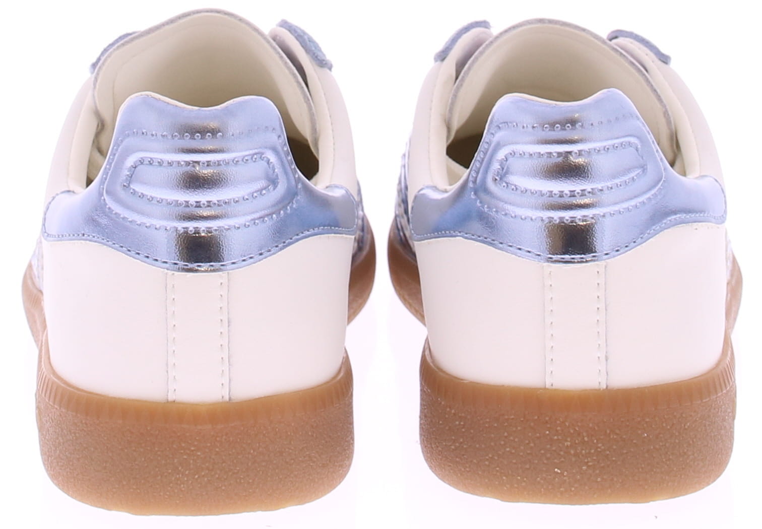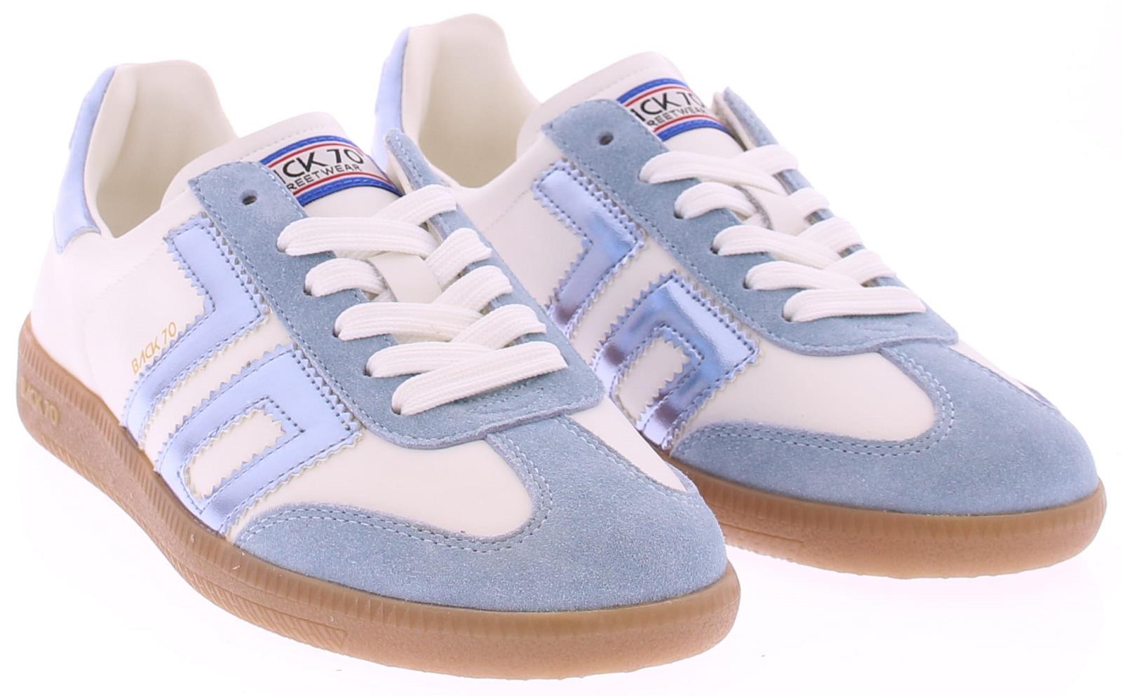 Light blue suede and white leather sneakers from Back70 for women. These retro women's sneakers from Back70, the CLOUD 2505-19, in light blue and white, have a honey-colored sole and a white logo and heel counter. The sole is removable. Stylish, comfortable, and perfect for any casual outfit!
