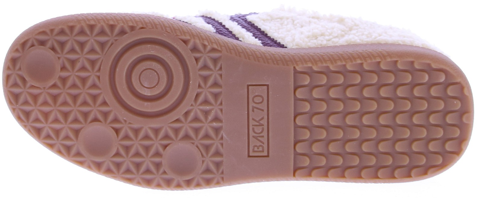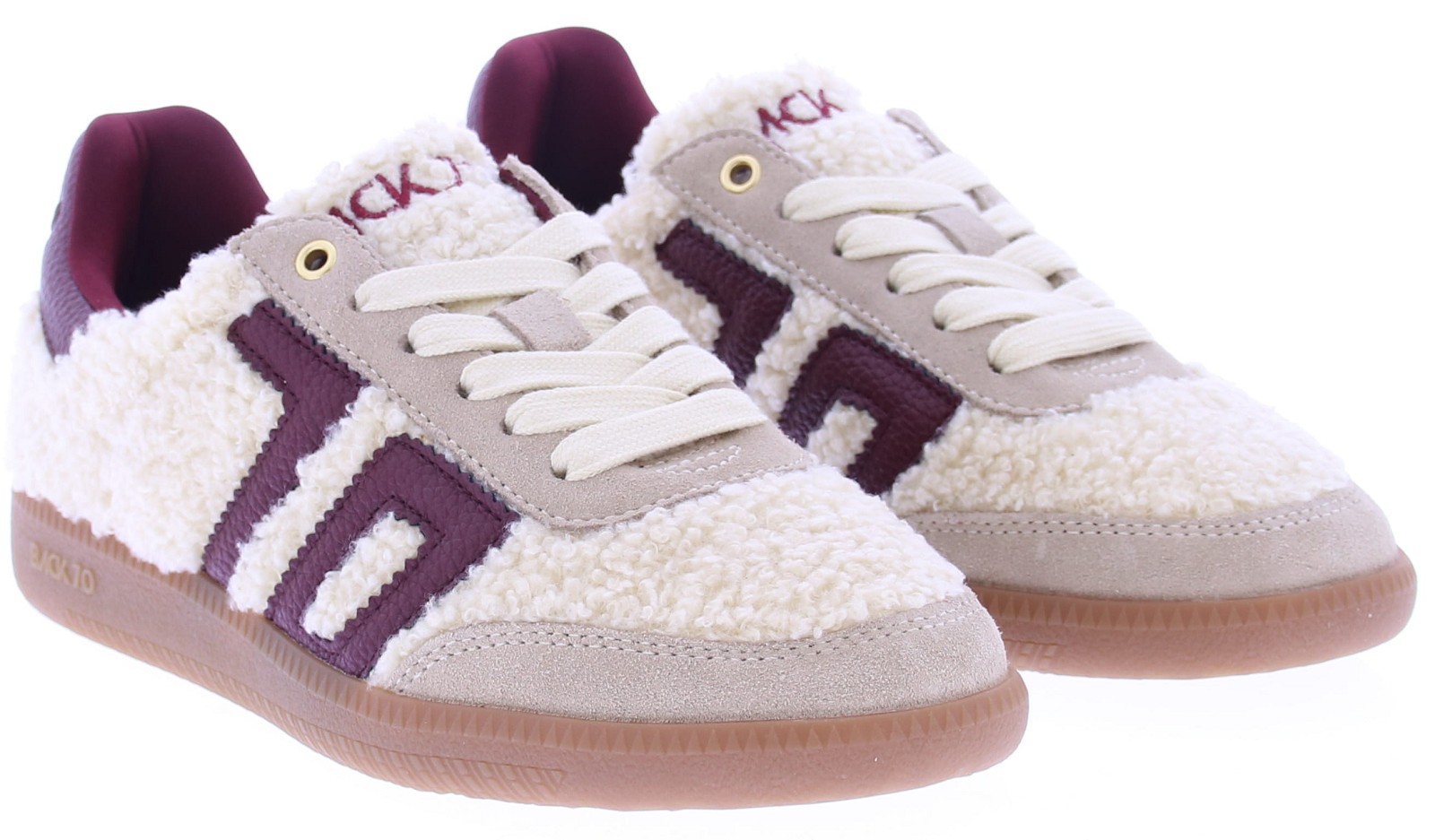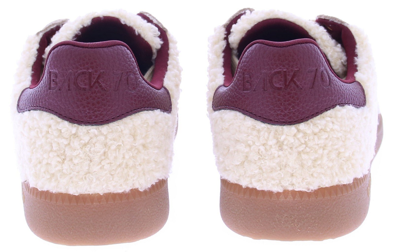 Beige teddy and suede sneakers for women from Back70. These retro sneakers feature a teddy and suede upper with a burgundy leather logo on the side. The honey-colored sole has a fine tread. These sneakers are currently on trend, perfect with wide-leg jeans or simply wear them with a dress for a casual look.