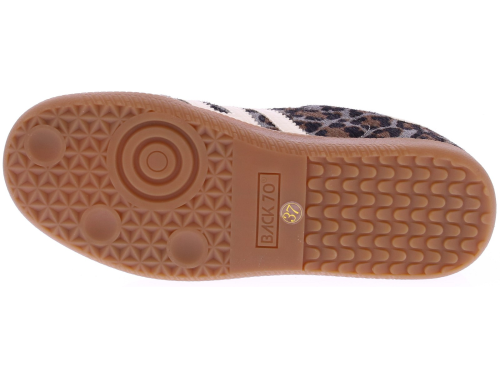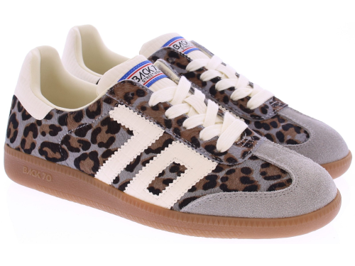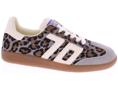 Gray suede women's sneaker with a leopard print from Back70. This retro women's sneaker from Back70, the CLOUD P21, features a gray leopard print, a honey-colored sole, and a white logo and heel counter. The sole is removable. Stylish, comfortable, and perfect for any casual outfit!
