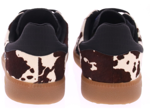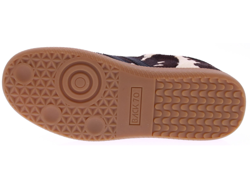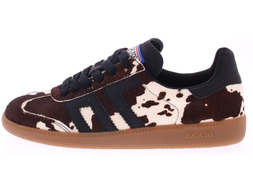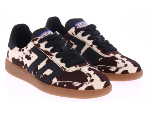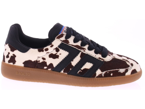 Cow print sneaker from Back70 for women. This retro women's sneaker from Back70, the CLOUD CL10 in black and white, features a honey-colored sole and a black logo and heel counter. The sole is removable. Stylish, comfortable, and perfect for any casual outfit!