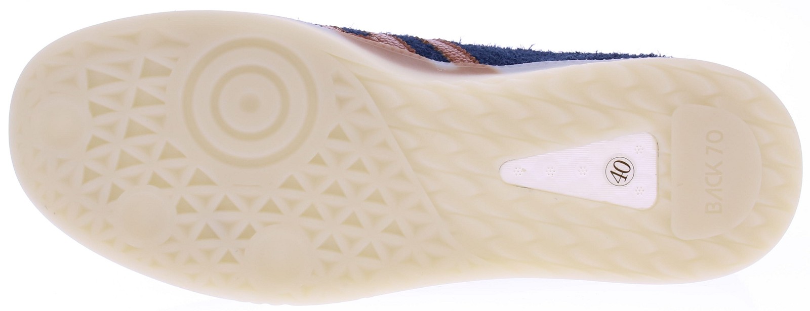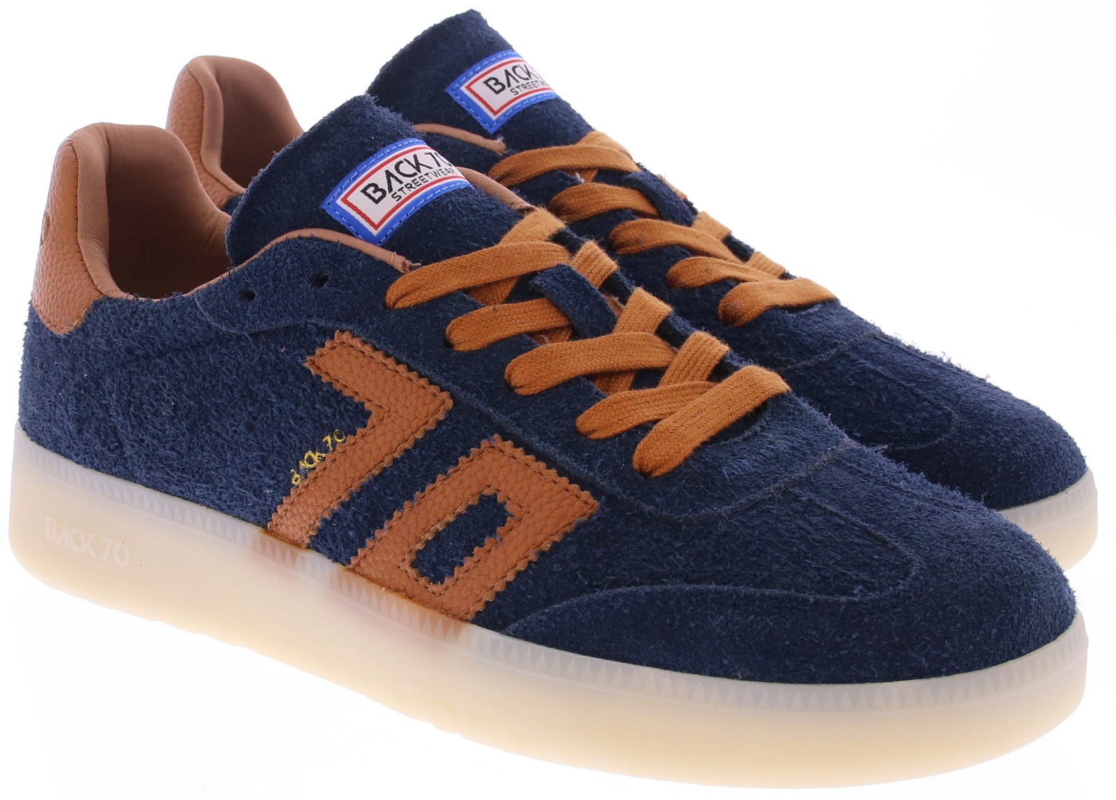 The Back 70 BOSTON LS01 is a distinctive sneaker with an authentic indoor silhouette, inspired by indoor soccer shoes from the '70s and '80s. The combination of navy suede and cognac accents gives this shoe a retro look that effortlessly complements contemporary streetwear. The transparent rubber sole provides both comfort and character.