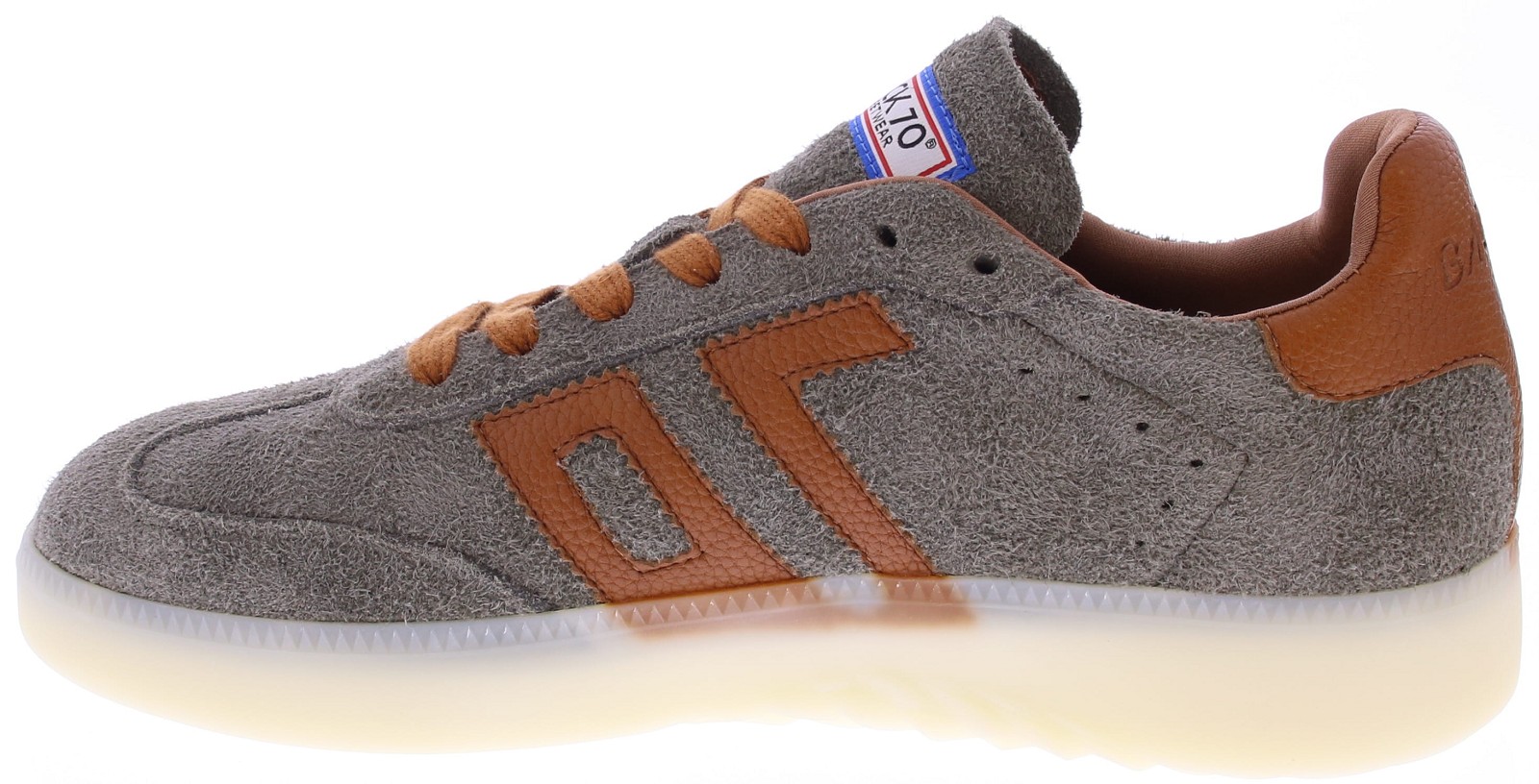 The Back 70 BOSTON LS02 is a retro-inspired indoor sneaker with an authentic look. Crafted from anthracite suede with cognac-colored details and a characteristic transparent sole, this shoe exudes Scandinavian simplicity and vintage flair. A must-have for those who appreciate original details and exceptional comfort.