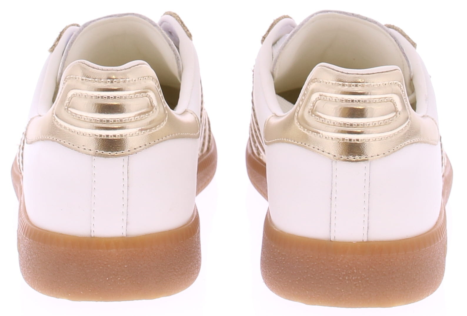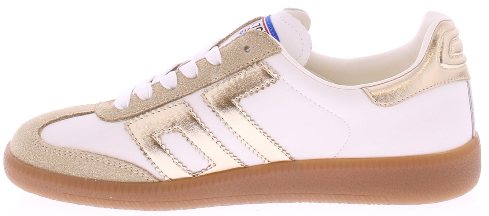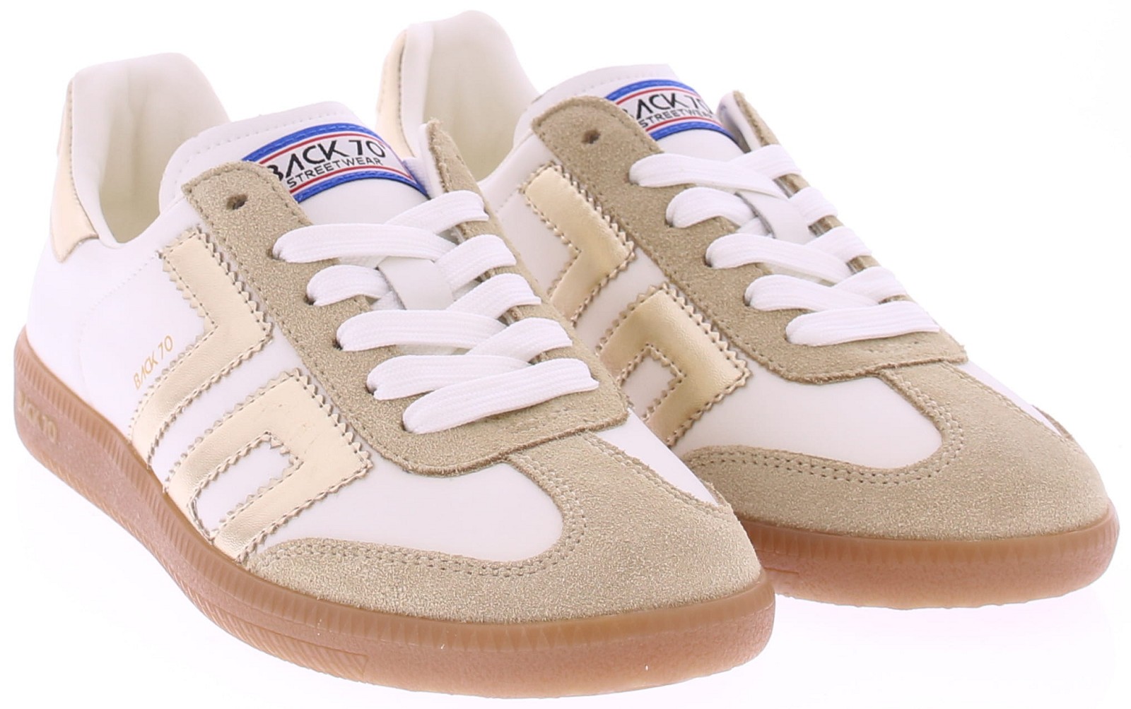 Beige suede with metallic gold and white leather sneakers from Back70 for women. These retro women's sneakers from Back70, the CLOUD 2505-17, in white and gold, have a honey-colored sole and a metallic gold logo and heel counter. The sole is removable. Perfect for any casual outfit. Buy women's sneakers from Back70 now at Klijsen Schoenmode. Free shipping from €79.95. Order before 3 PM, shipped the same business day.