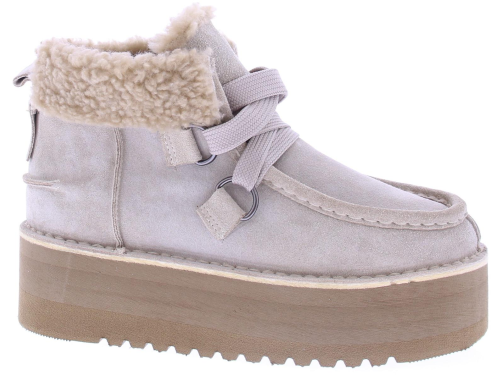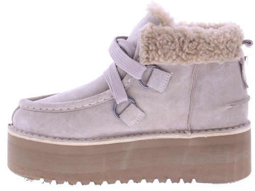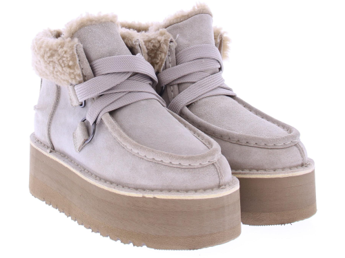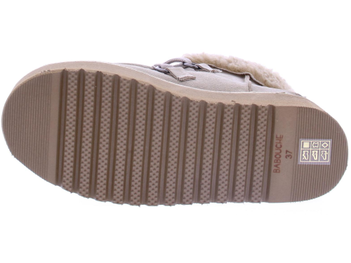 Beige suede lace-up shoe for women by Babouche. This shoe features a platform sole, is fur-lined, and fastens with a nice wide lace.