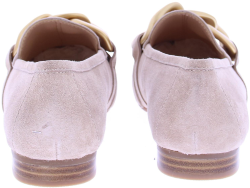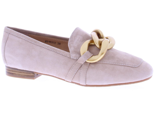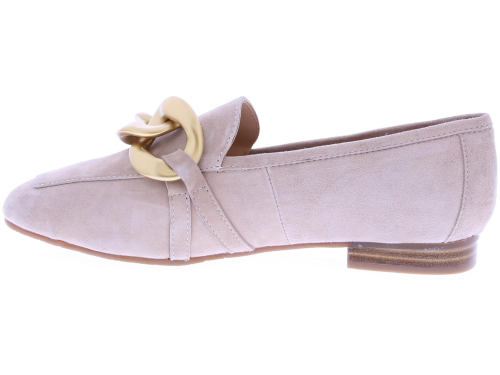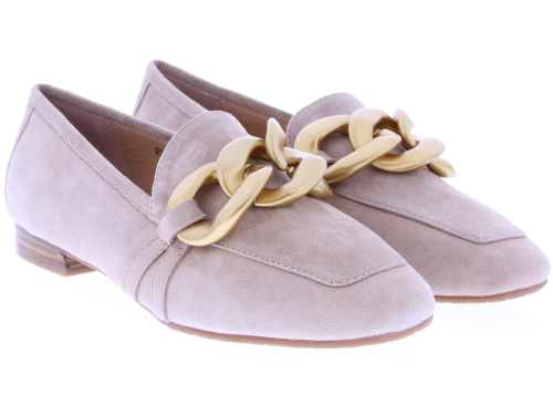 Beige suede women's loafer by Di Lauro. This loafer with a round toe and a matte gold-colored bit on the instep. This model is leather-lined, with a fixed footbed, and has a synthetic sole and a low heel of 2 centimeters. With this beautiful loafer you give every outfit a chic look!