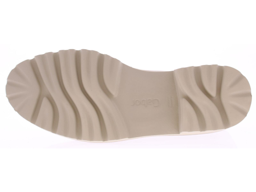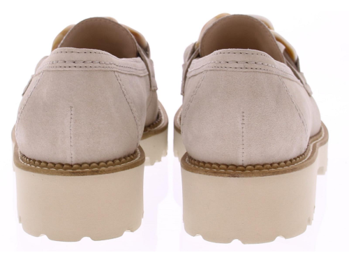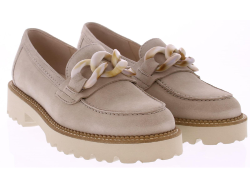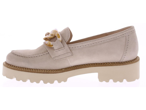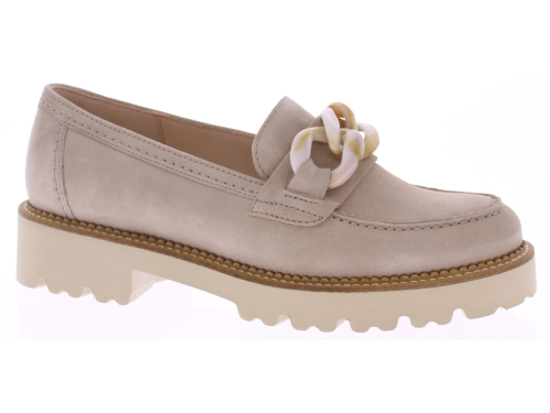 Beige suede women's loafer by Gabor. This loafer has a plastic bit on the instep and is equipped with a beige rubber chunky sole with a brown leather edge on the top.