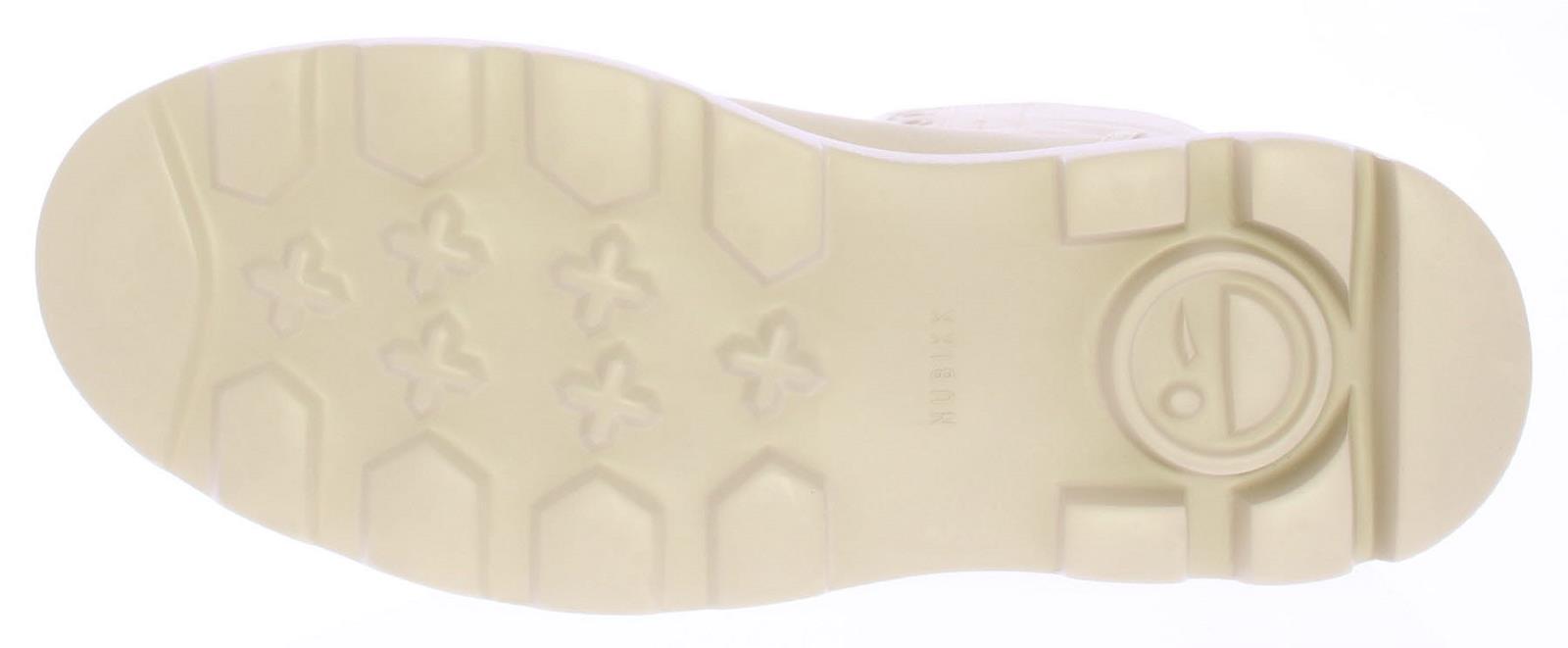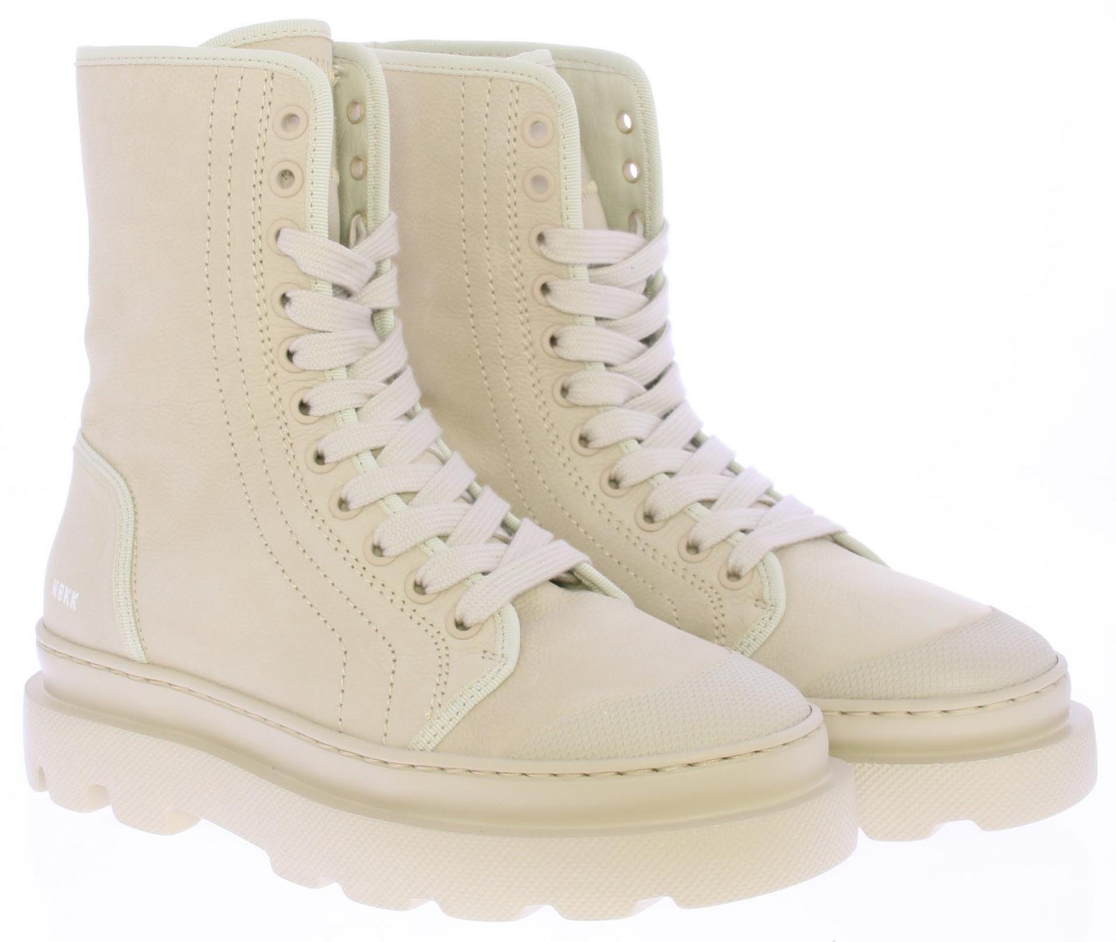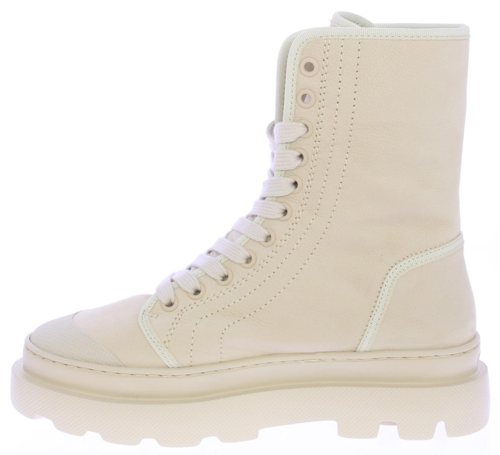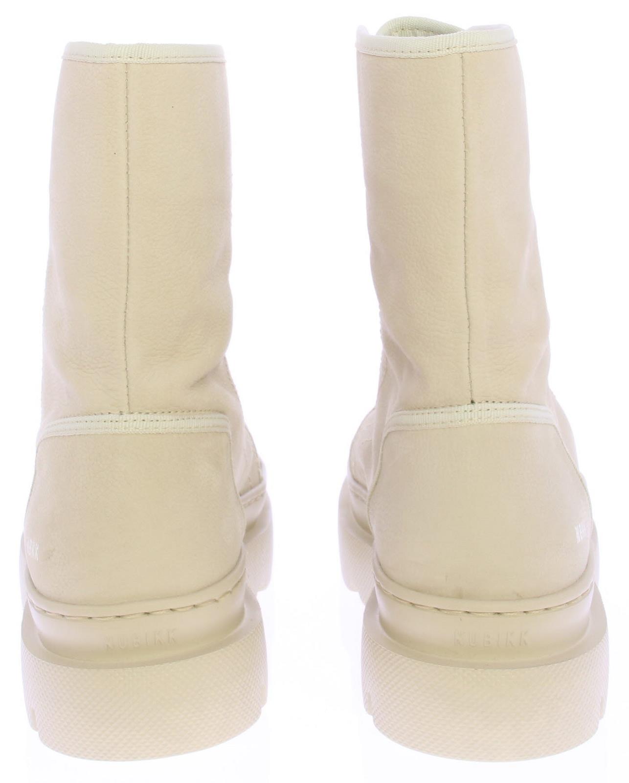 Beige nubuck women's ankle boot from Nubikk. This stylish boot features a thick, sporty rubber sole in the same color as the boot itself. The boot fastens with laces that reach over the ankle.