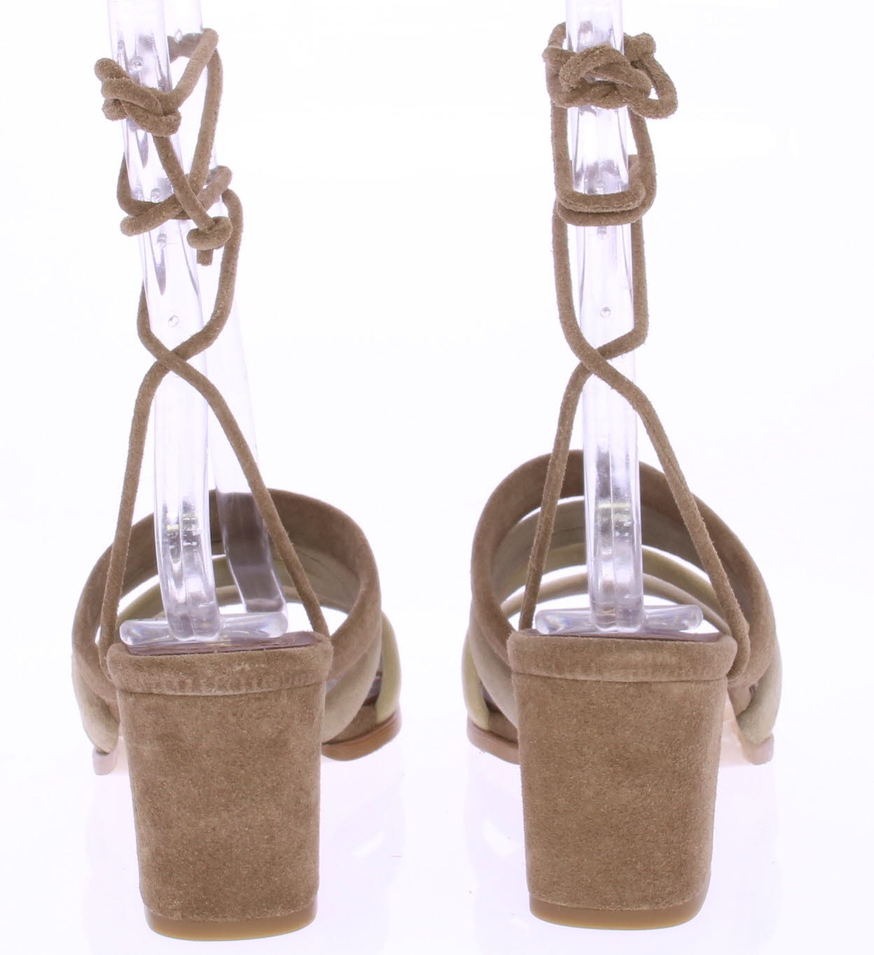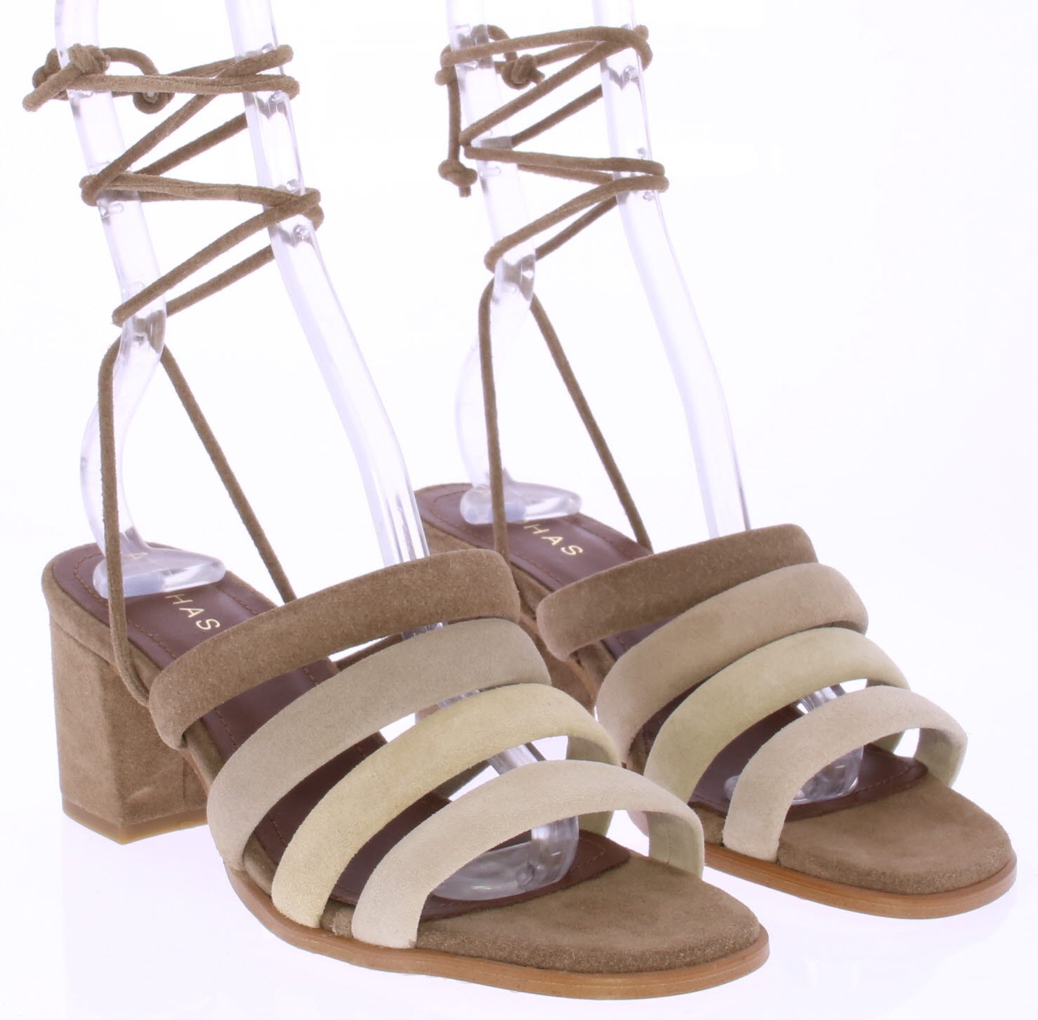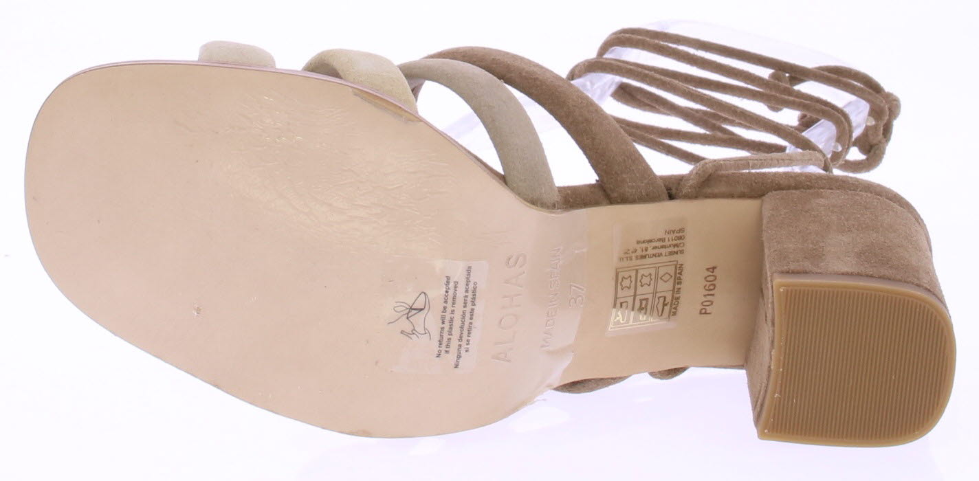 Beige / taupe-colored suede women's sandal by Aloha's. This sandal features four straps running across the instep from light beige to light brown. The sandal can be secured around the ankle with playful straps. This shoe features a synthetic sole and has a 6 cm heel.