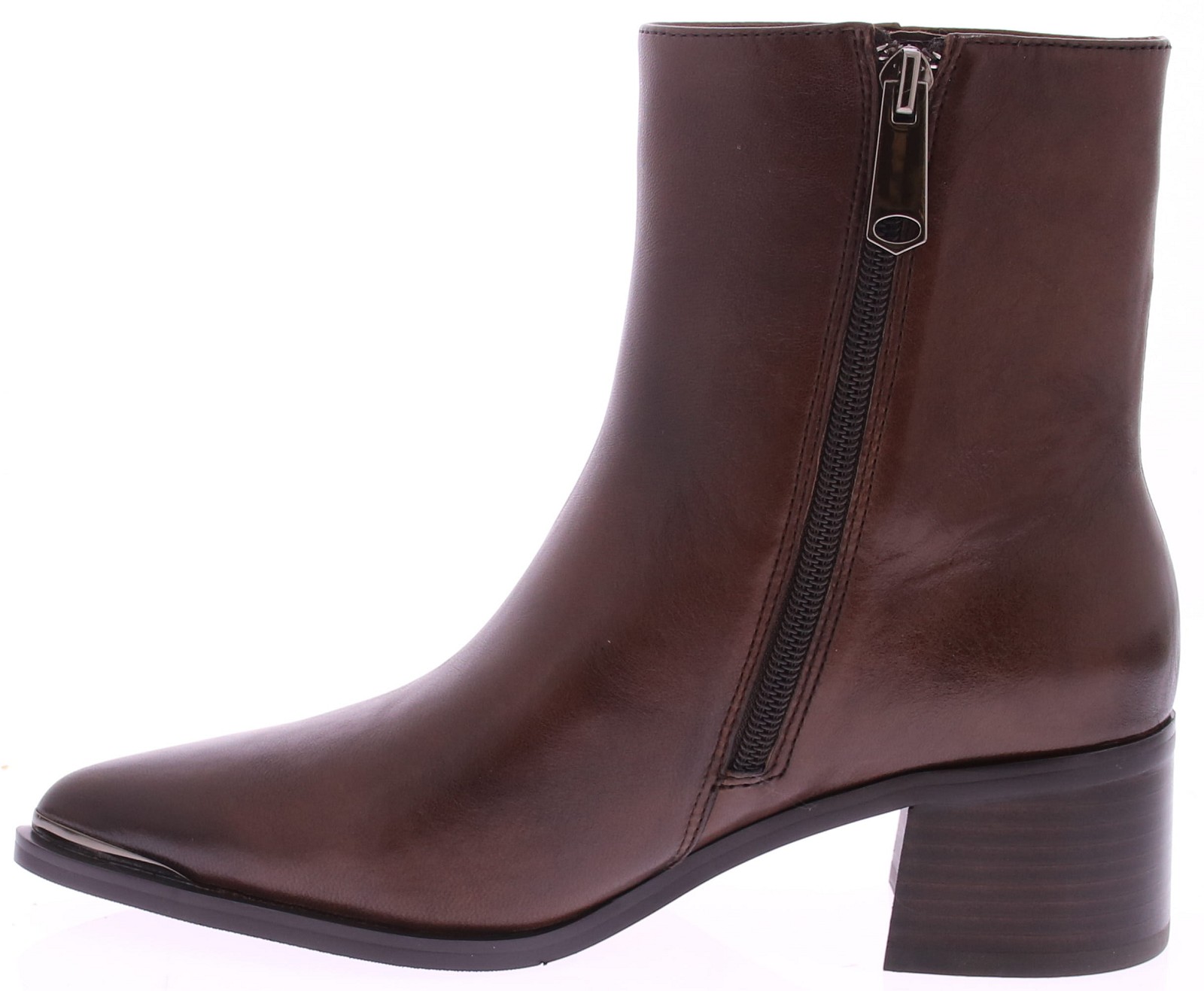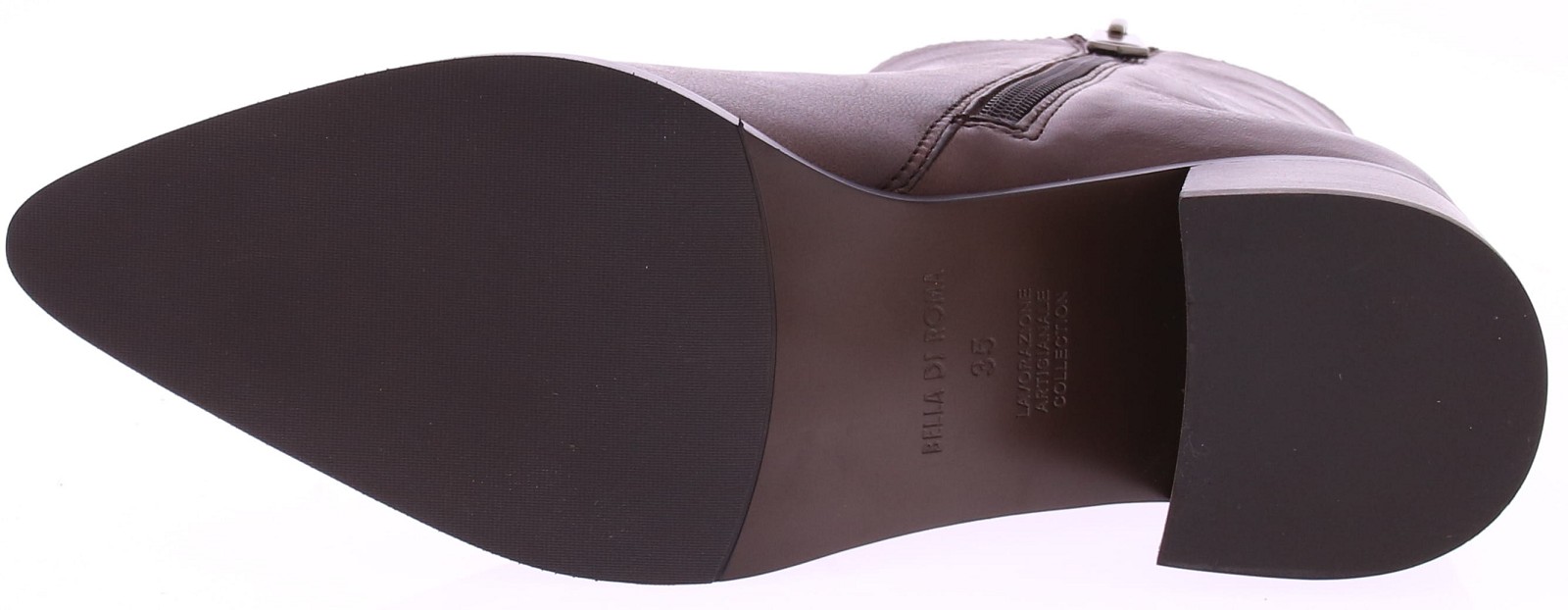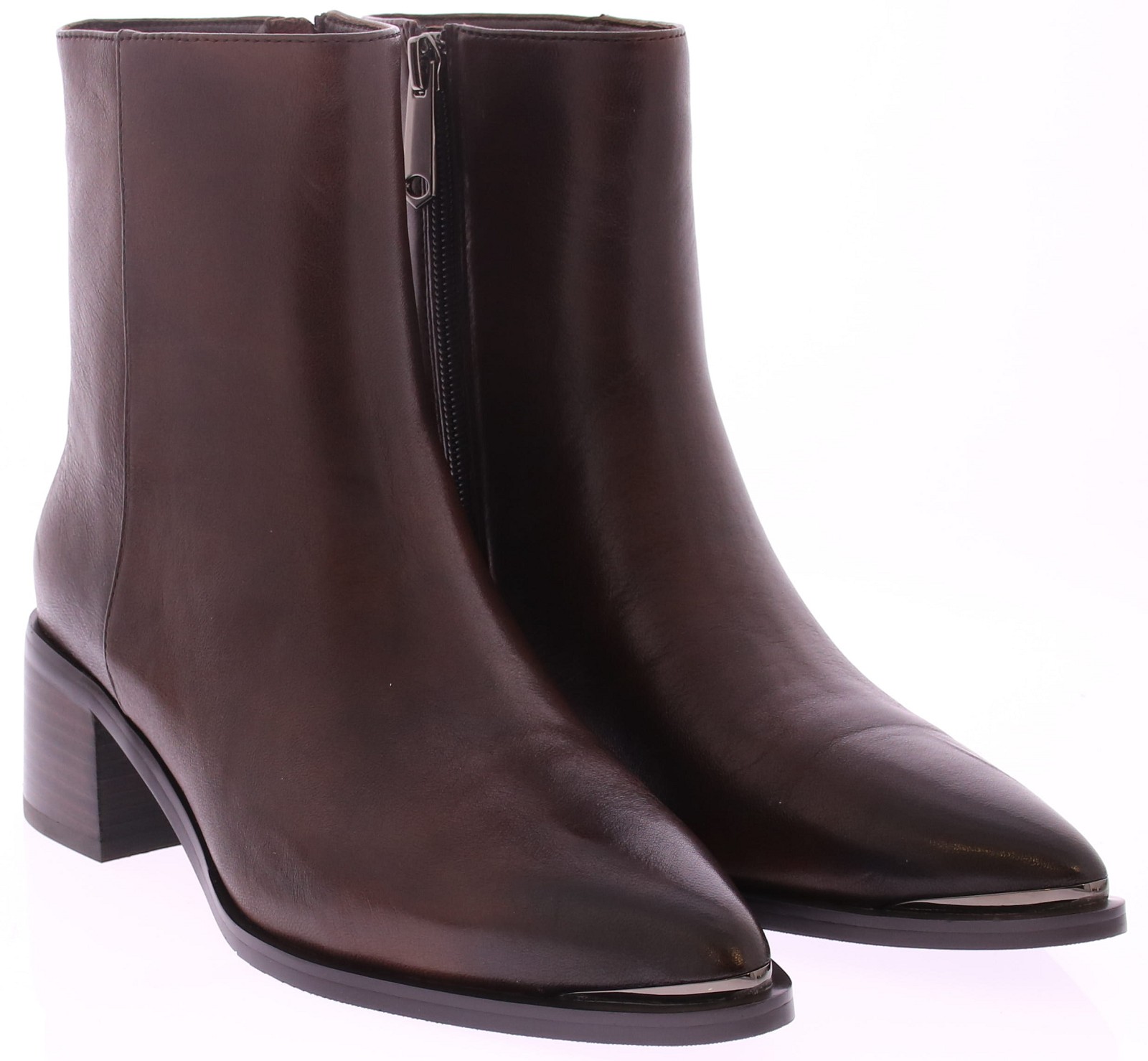 Dark brown leather women's short boot from Bella di Roma. This stylish Bella di Roma boot is crafted from soft nappa leather and features a beautiful metal finish at the toe. The leather lining provides extra comfort, and the inside zipper makes it easy to put on and take off. The boot sits on a comfortable 4cm block heel. A stylish boot that you can wear with anything.