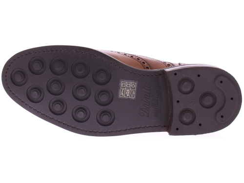 Men's lace-up brogue from Berwick, item 3818-K1, in vegan tan. This cognac-colored calfskin brogue is made using the Goodyear process and features a Dainite rubber sole. This is one of the strongest soles a manufacturer can purchase for a shoe. This combination of materials provides excellent support. The shoe is lined with calfskin.