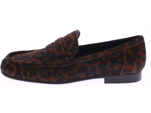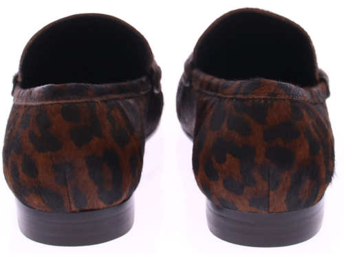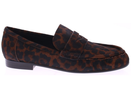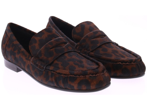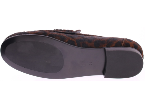 Brown and black women's loafers from Bibi Lou, 661Z91VK. Made of pony hair material with a leopard print, they feature a leather lining and a thin rubber sole. They feature a loop at the instep and a pleated toe cap, a common trend these days.