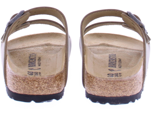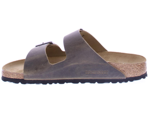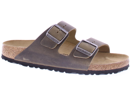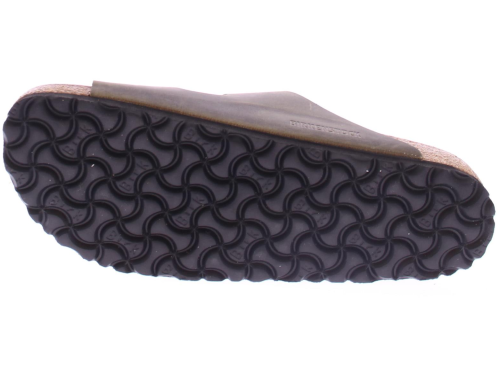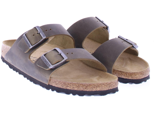 Birkenstock Arizona made of greased khaki leather on a cork footbed with rubber sole. The two straps over the foot are adjustable.