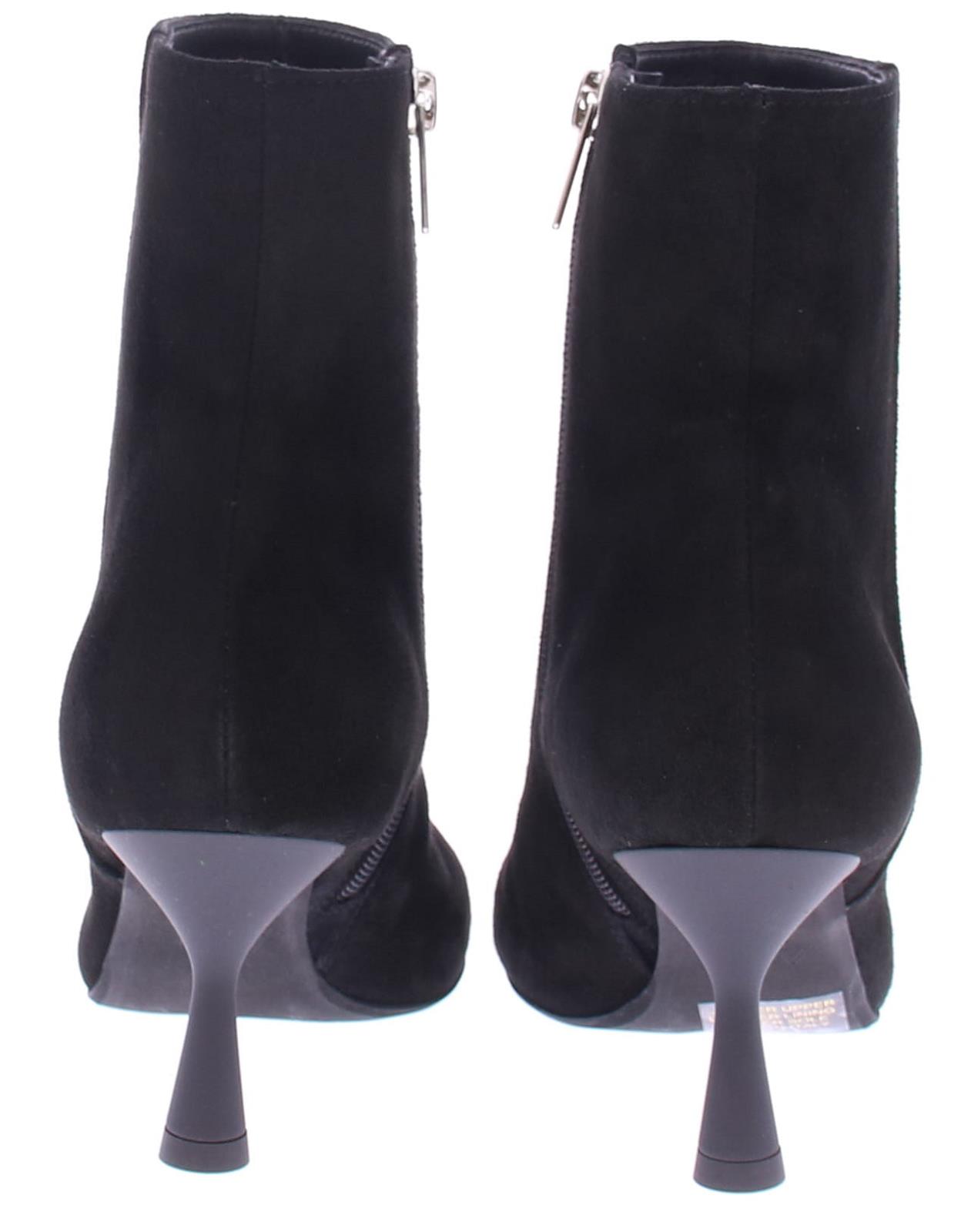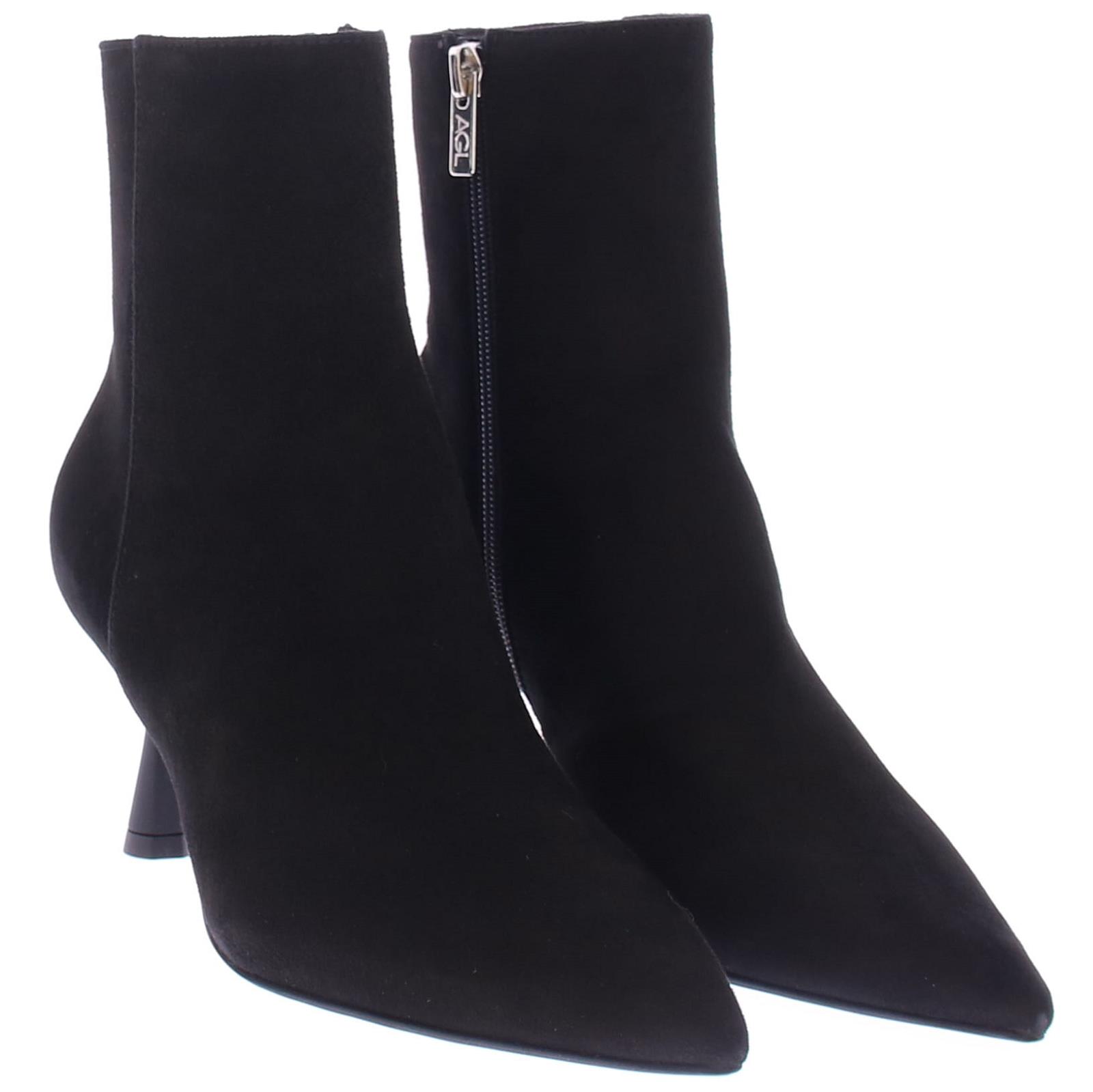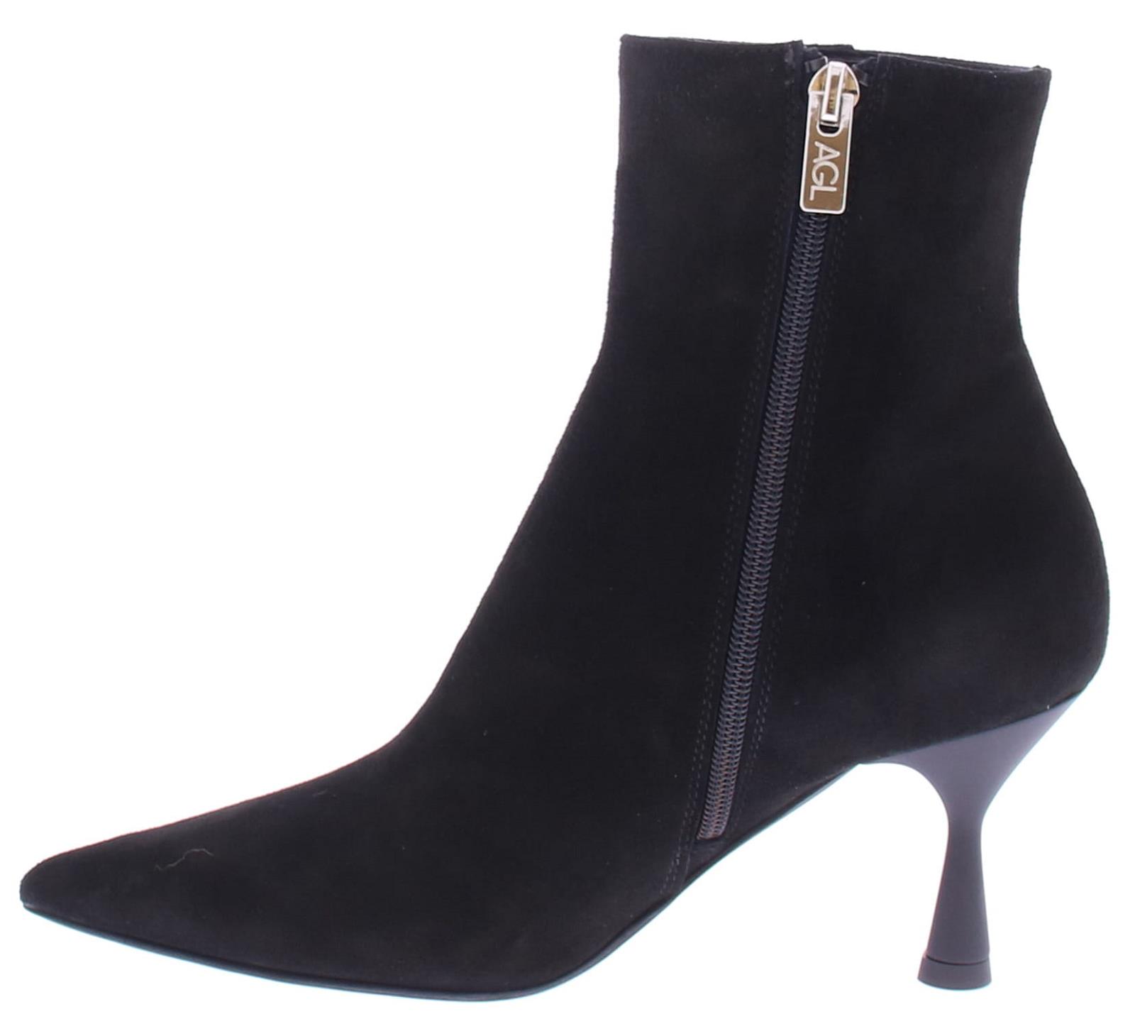 Black suede women's ankle boot from AGL. Made on a beautiful, elegant, pointed heel with a flared 7 cm heel. Very comfortable and soft thanks to the beautiful calf suede.