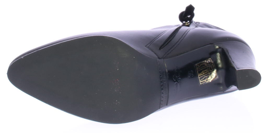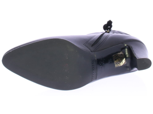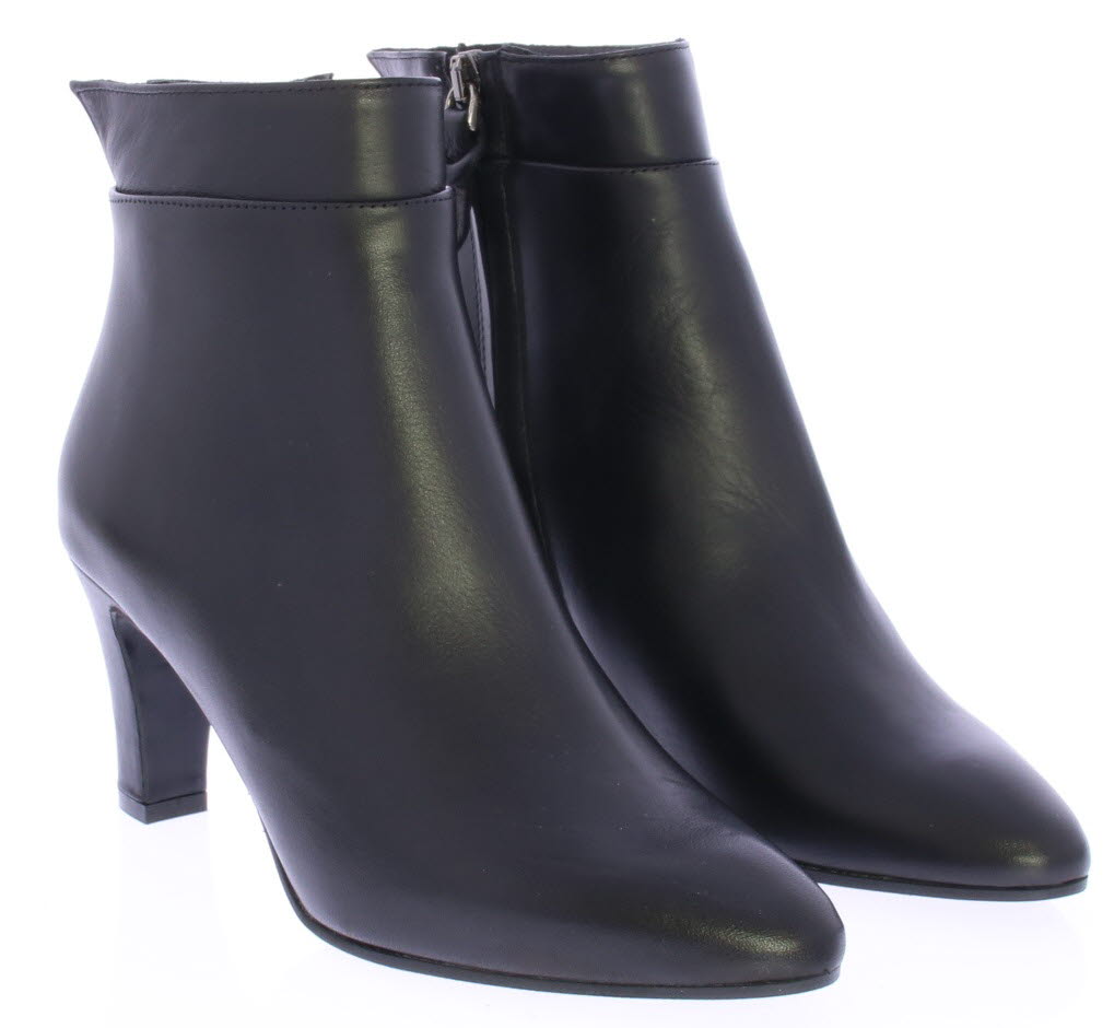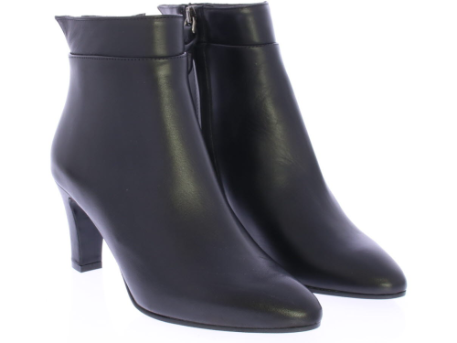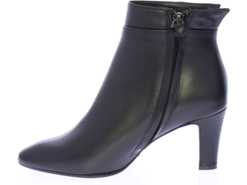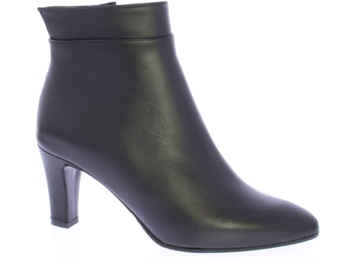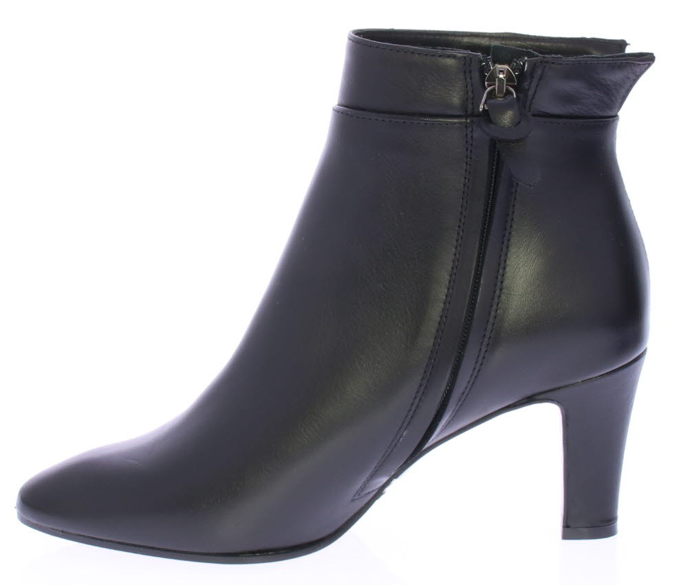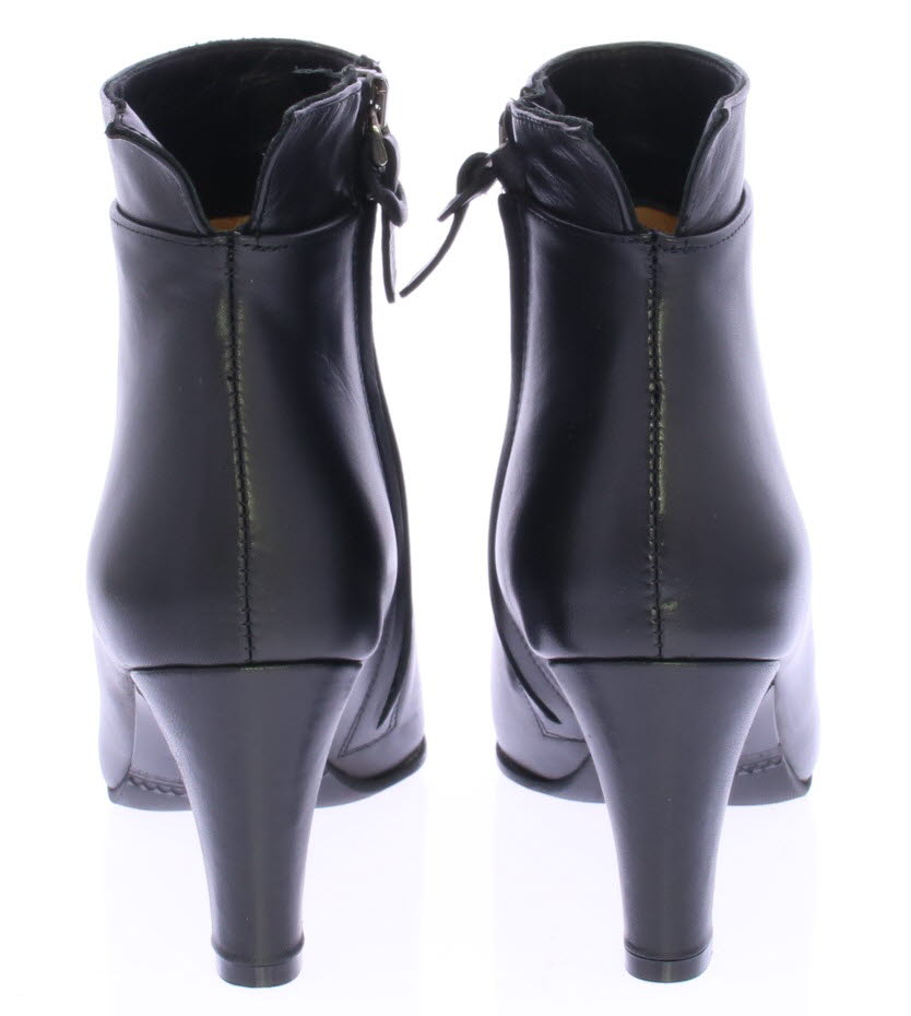 Black leather ankle boot by Cypres. Finished with a notched "collar" on the heel. There is a zipper on the side and the heel is 6.5 cm high. Elegant ankle boot that is also nice to wear with a skirt or dress.