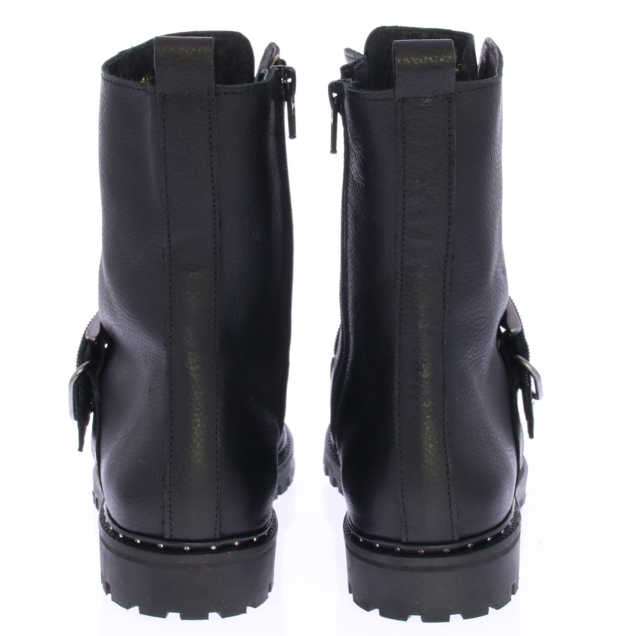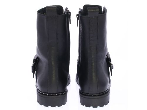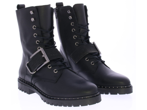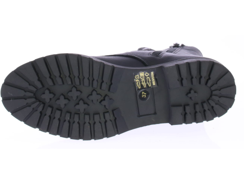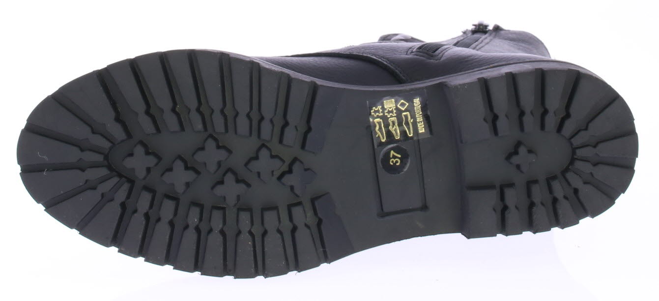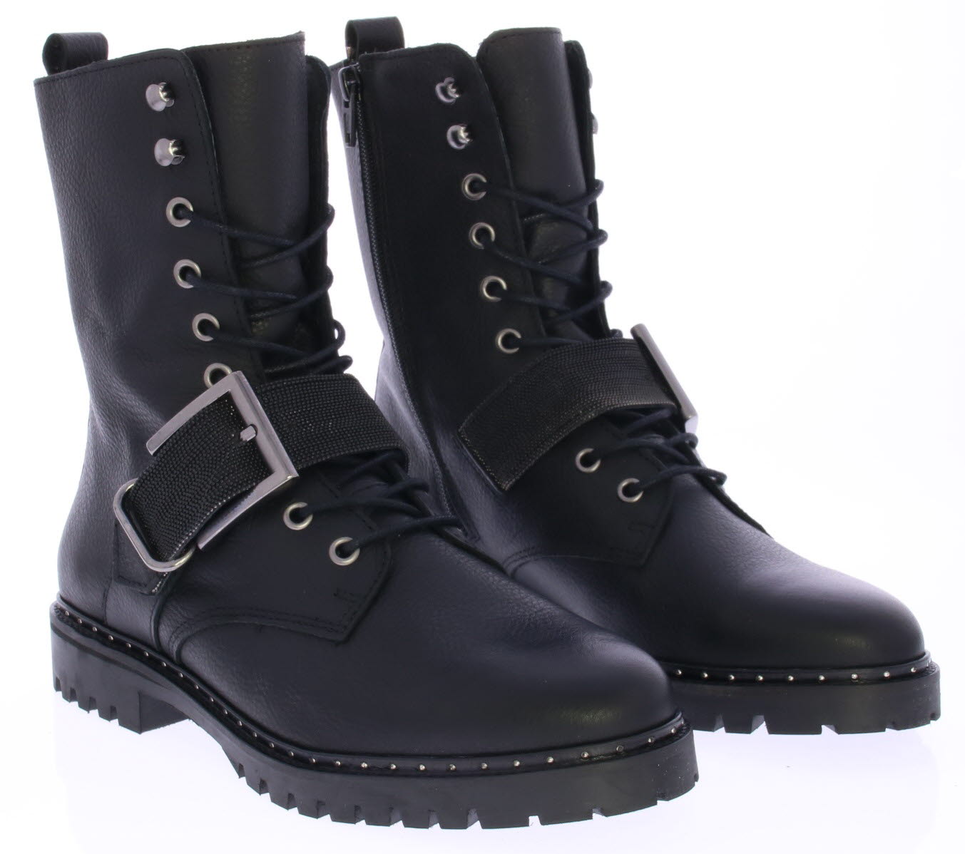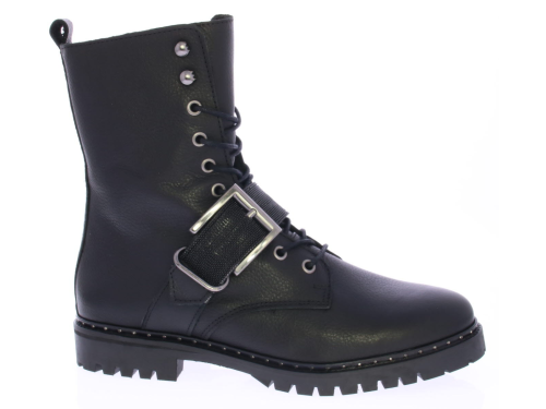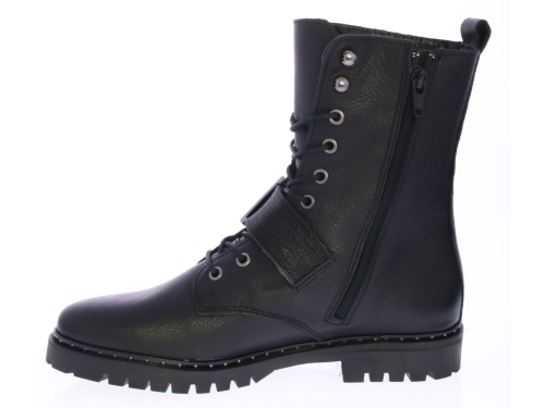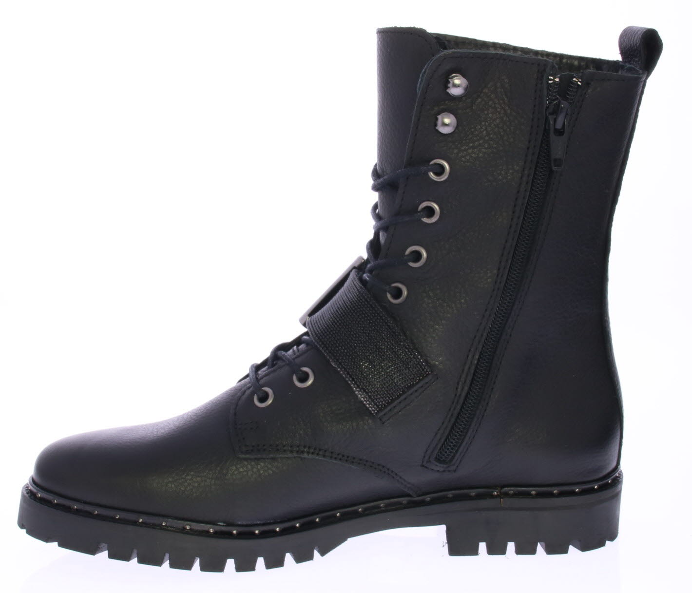Women's lace-up boot in black by Miss Behave. This black boot features a gunmetal glitter strap across the instep. The sole edge has small studs. The sole is made of rubber and the lining is leather.