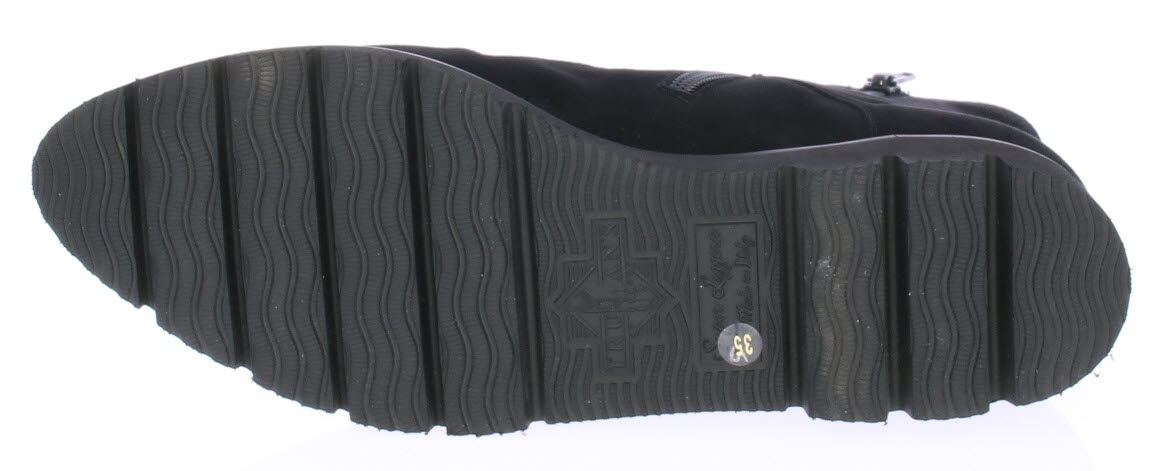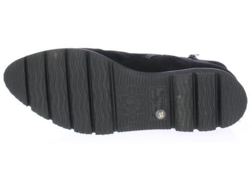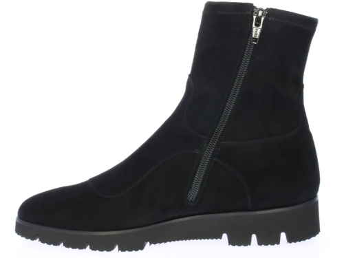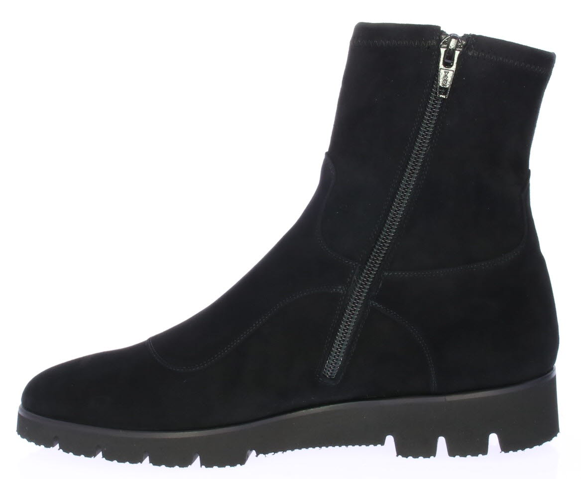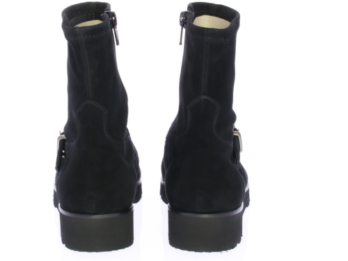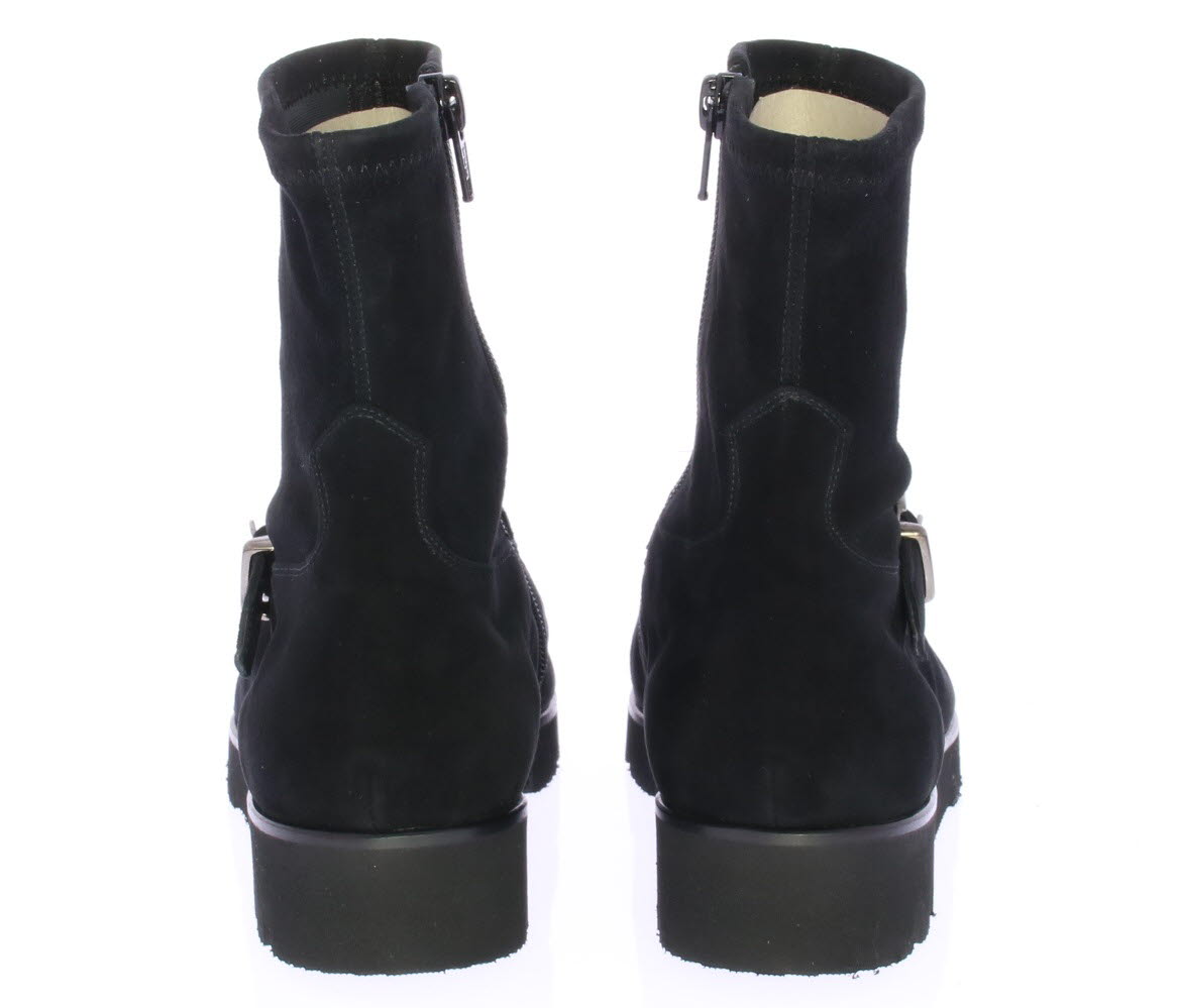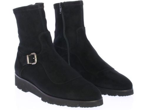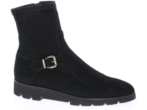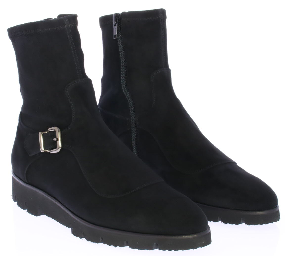 Black suede women's ankle boot by Trumans. Featuring a slightly pointed last and a lightweight, flexible sole. The shaft is made of stretched suede and has a zipper. The buckle is dark silver in color.