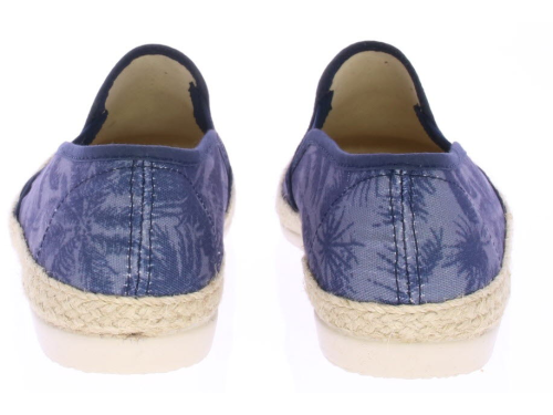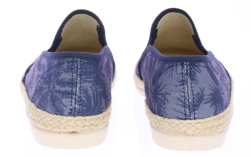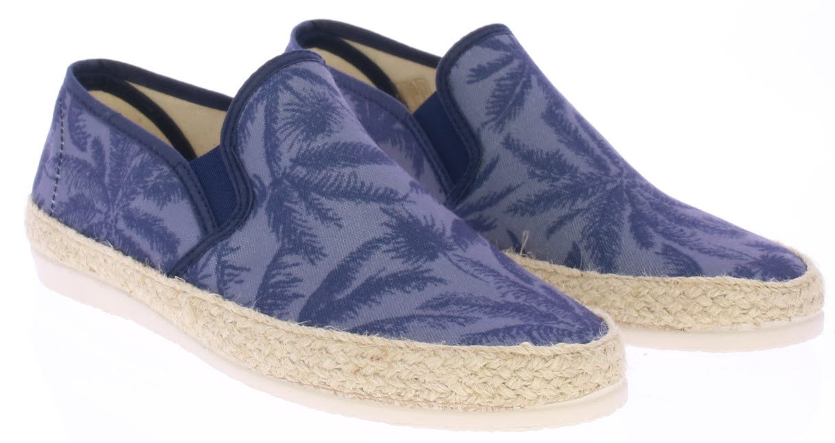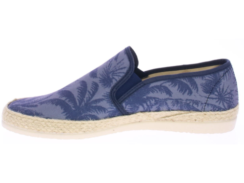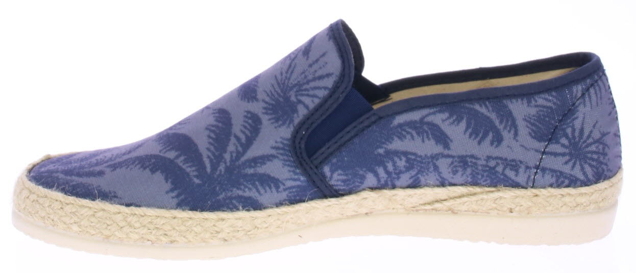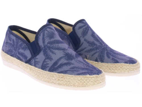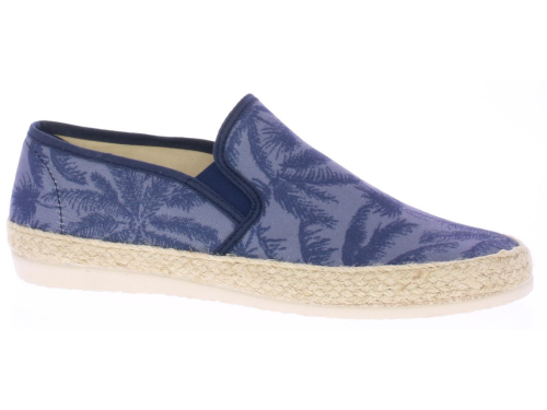 Blue fabric men's loafer from Cypres. The upper is printed with blue palm trees. The loafer has elastic on the sides for easy entry. A rope edge runs along the sole and the sole itself is made of rubber.