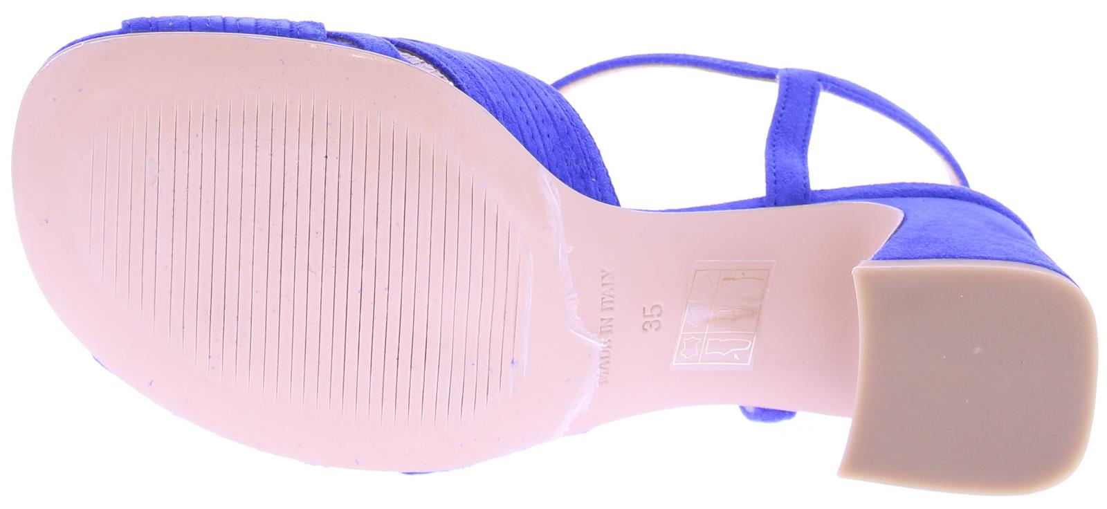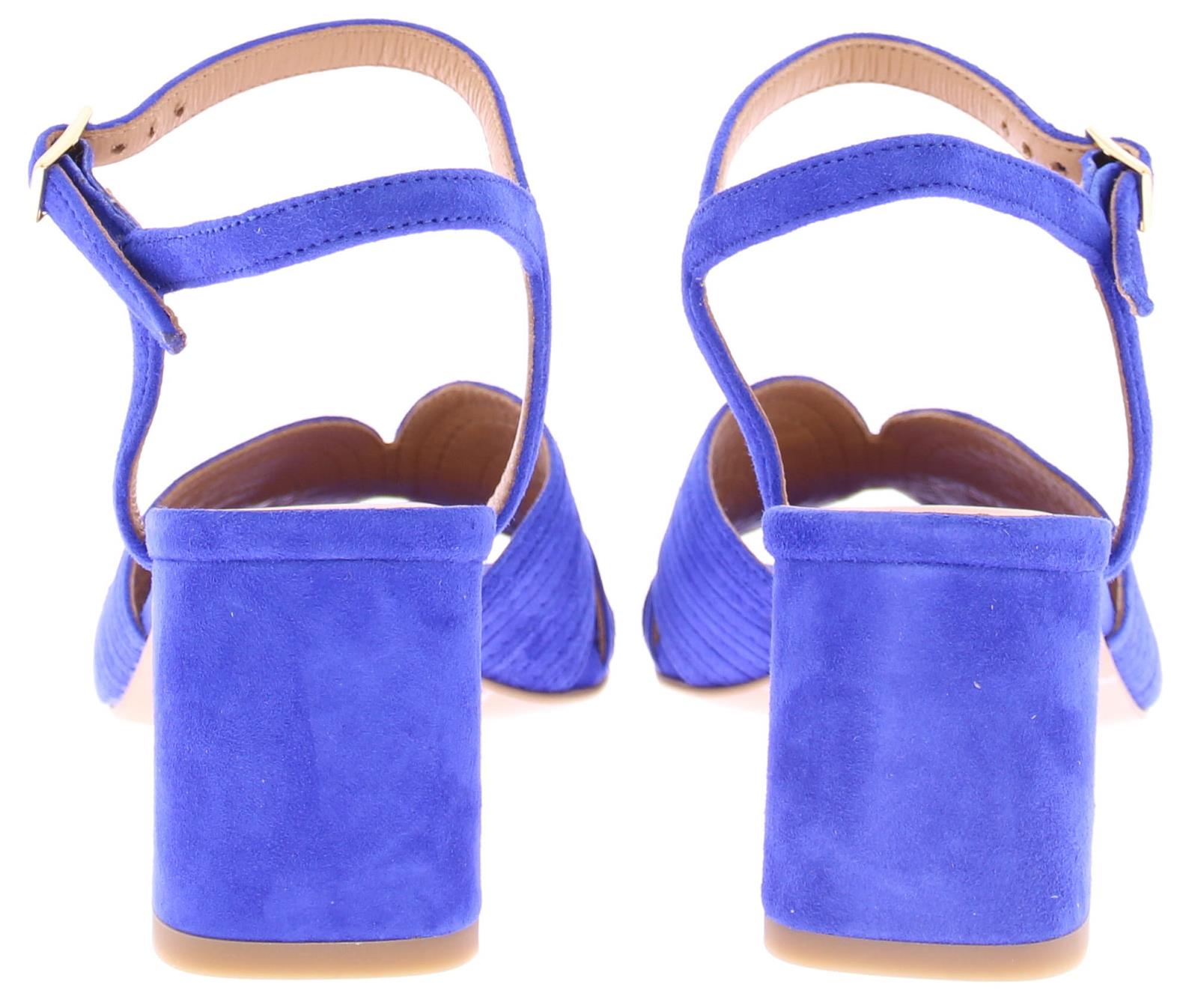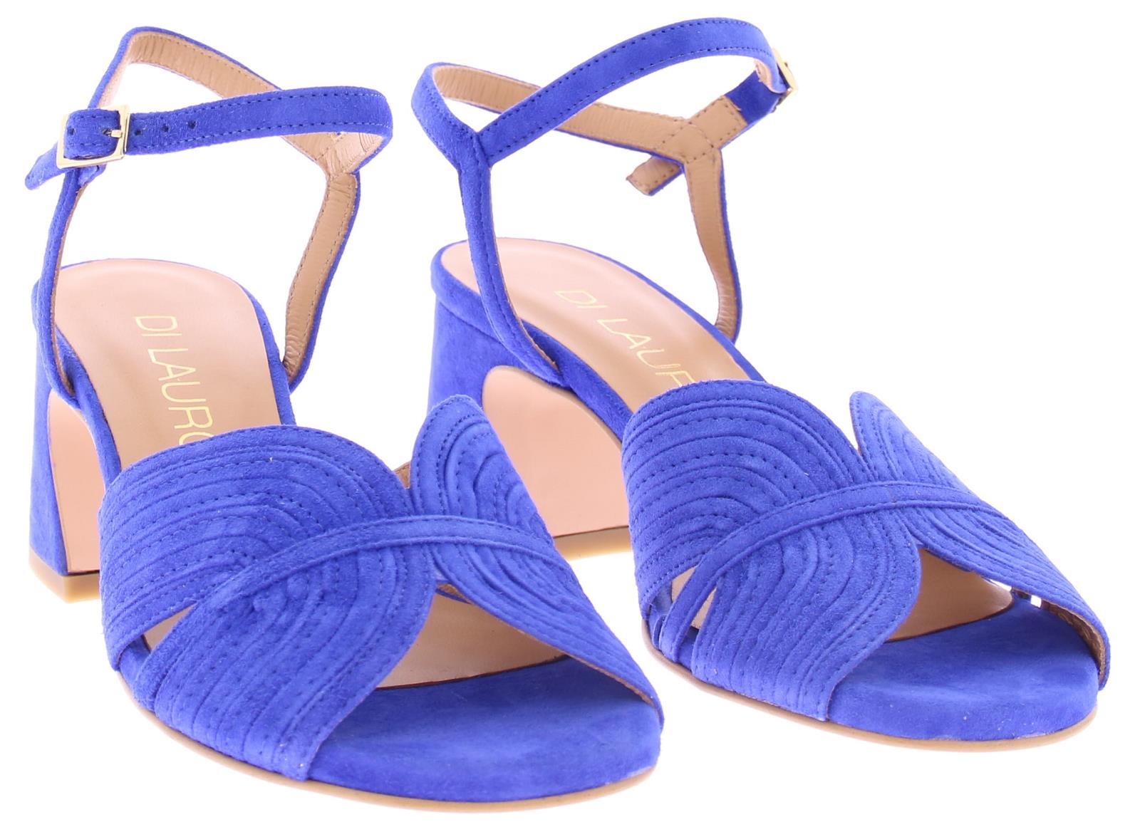 Cobalt blue suede women's sandal by Di Lauro. This model has a wide strap over the foot with stitched lines. The ankle strap is adjustable with a gold buckle. The covered block heel has a height of 5 cm and the sole is made of thunit.