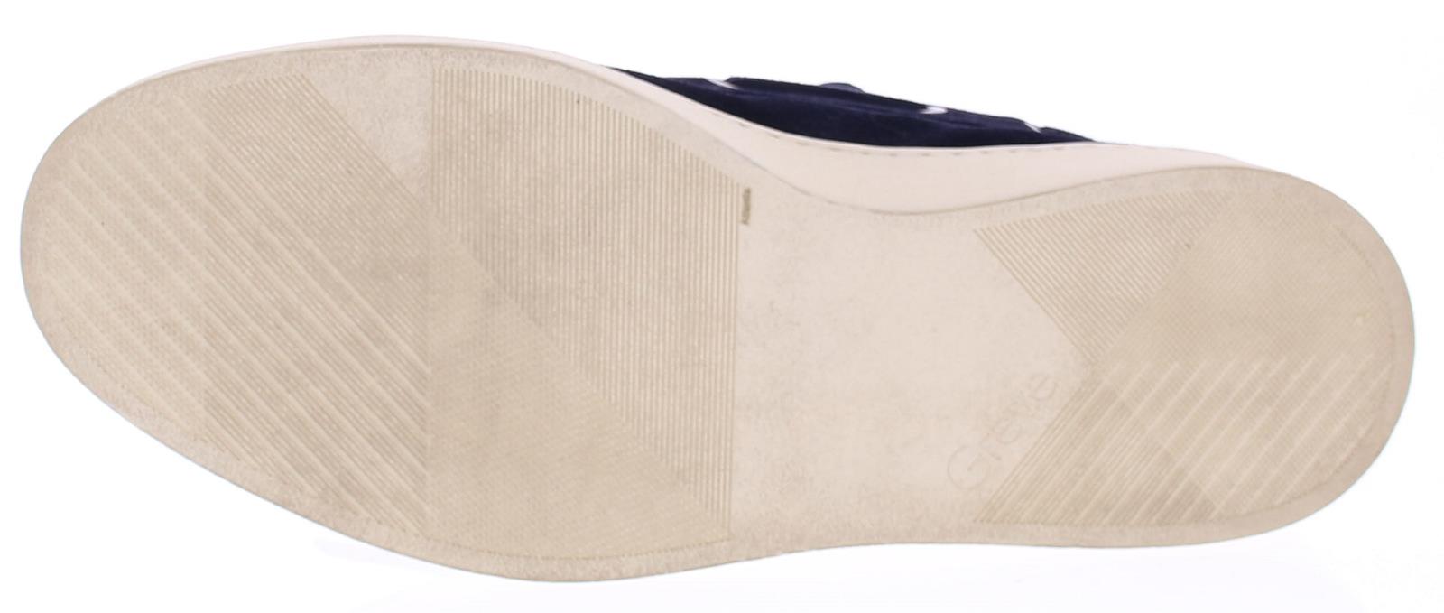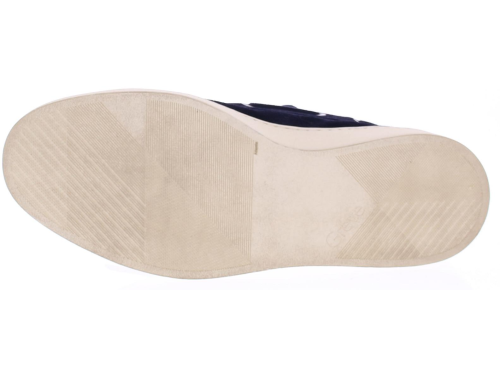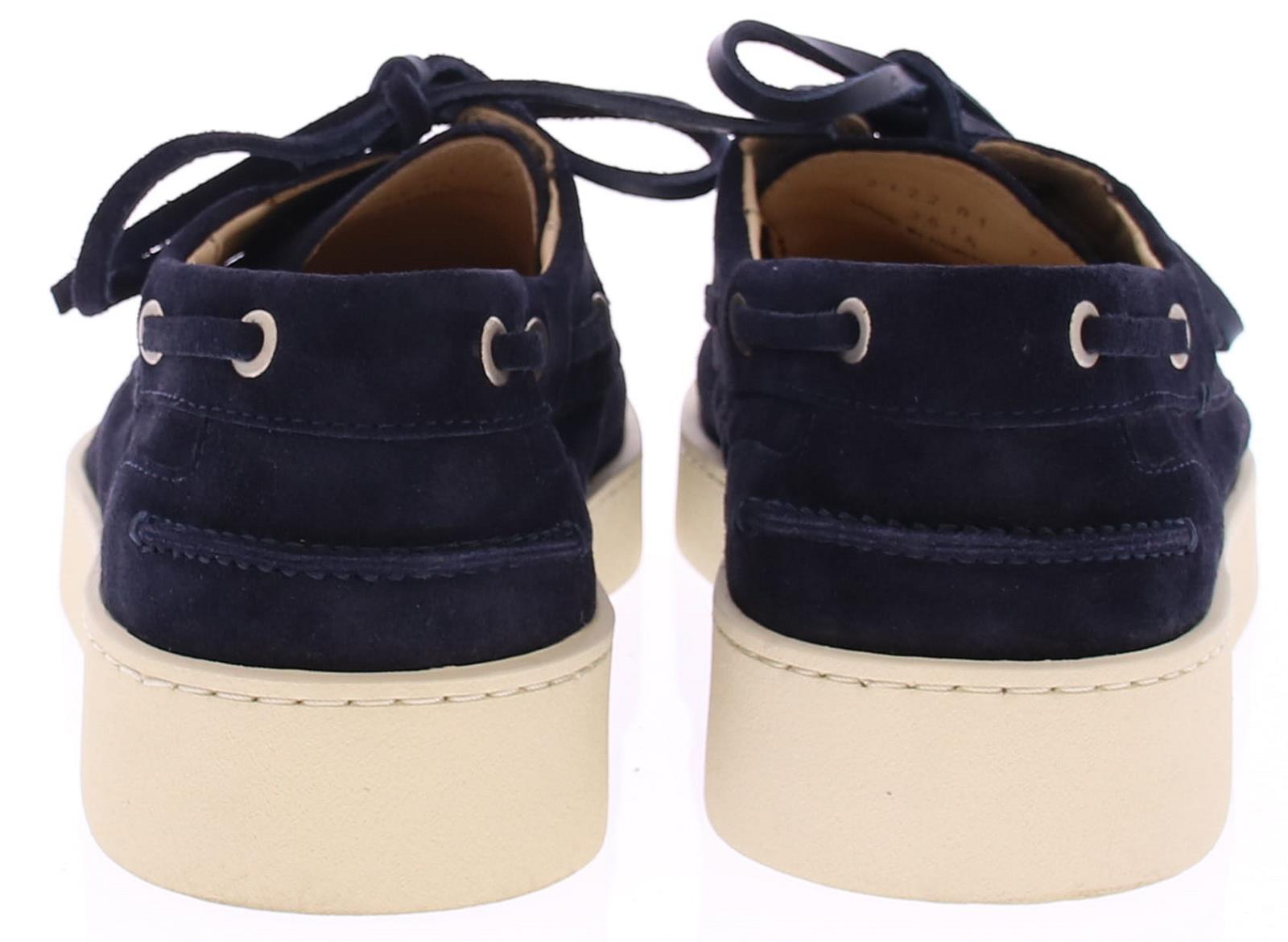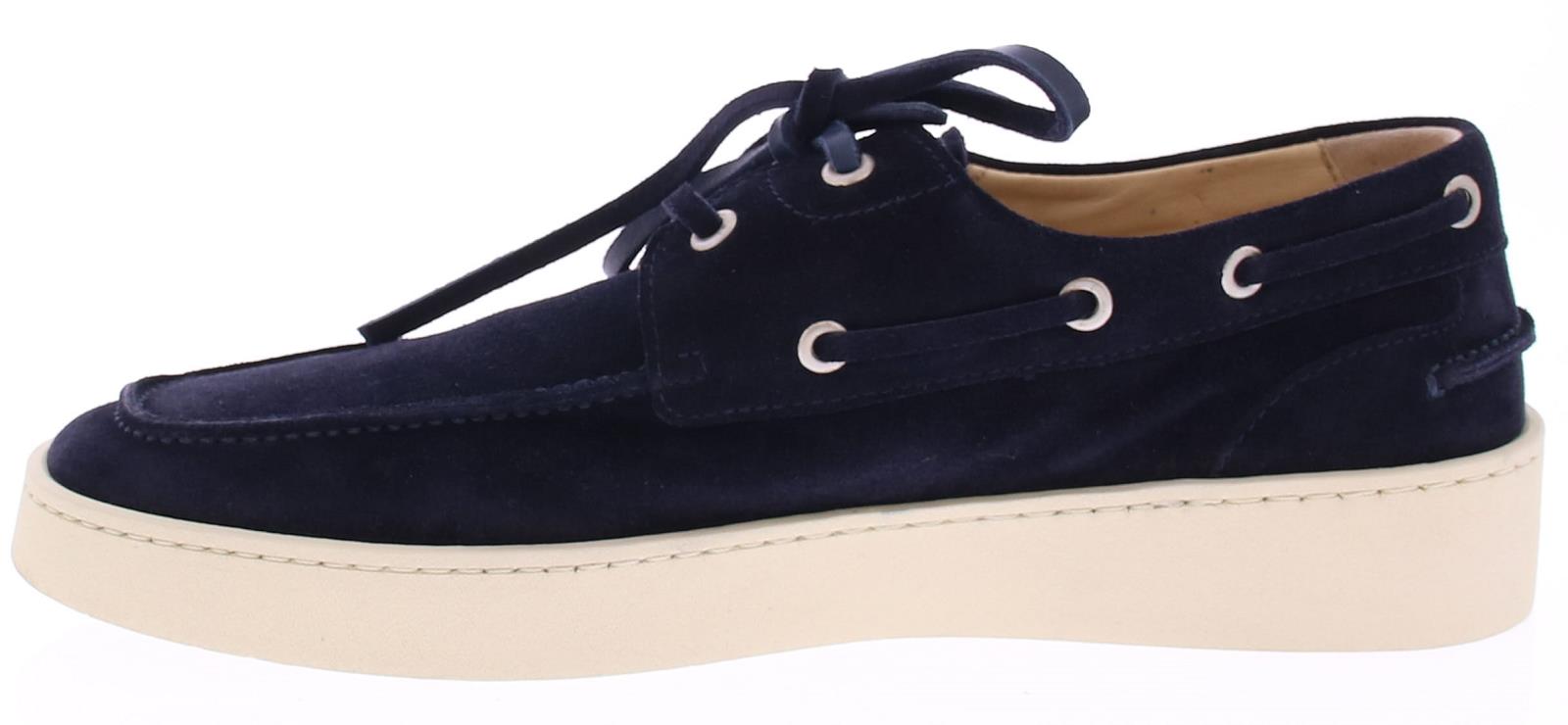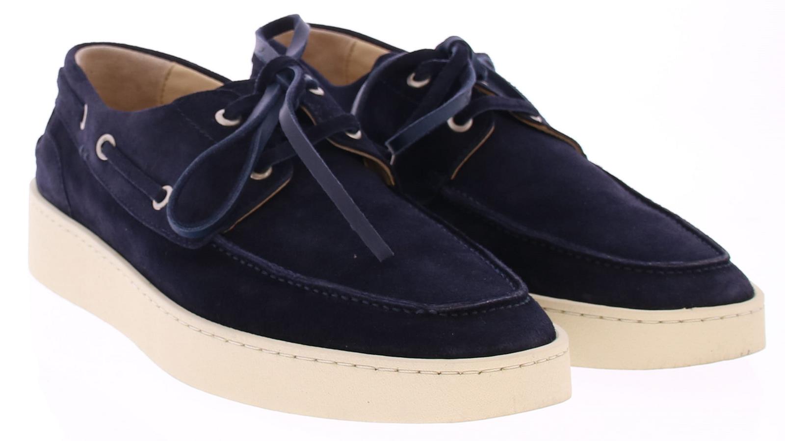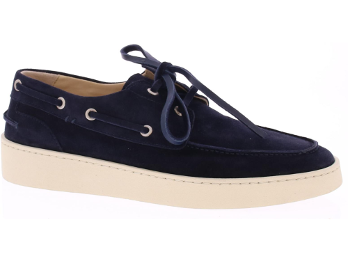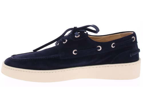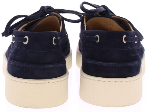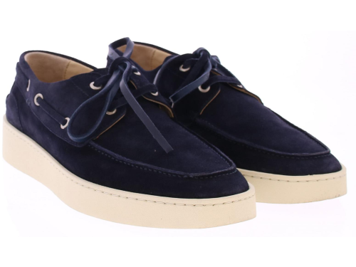 Dark blue suede men's boat shoe by Greve. This shoe has a leather lace and comes on a sporty white rubber sole.