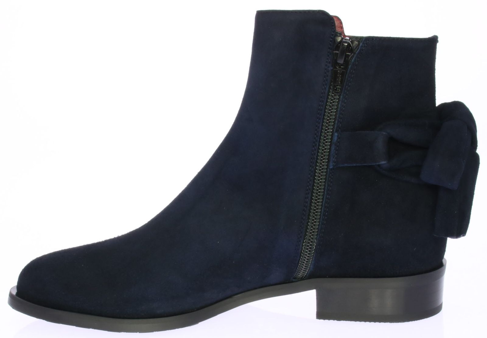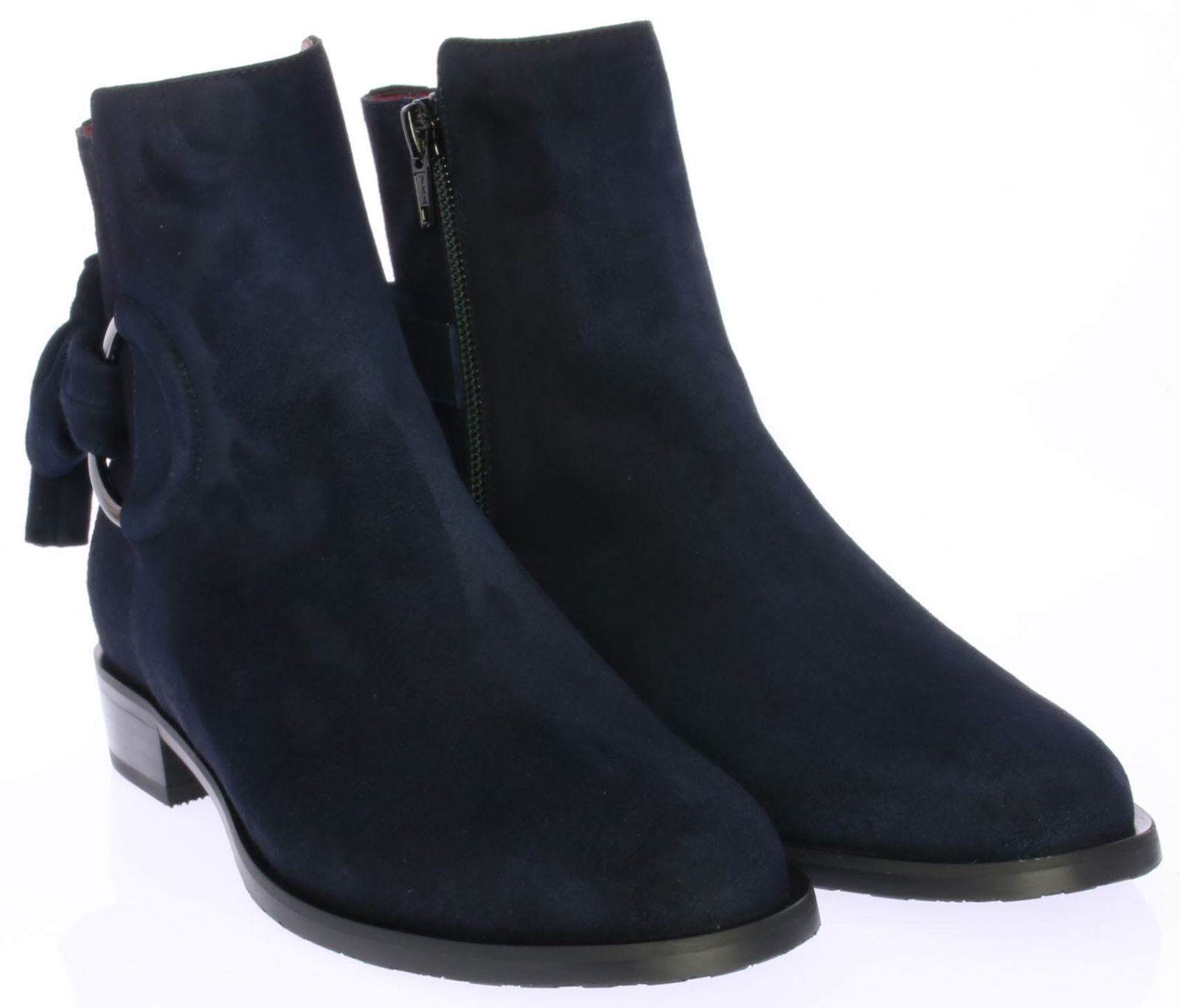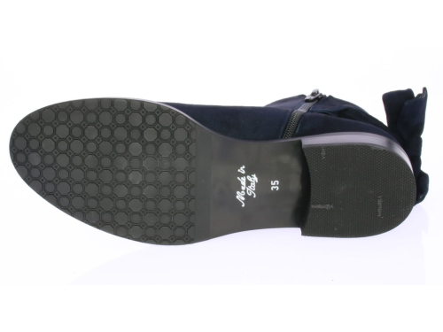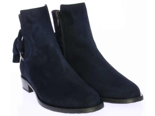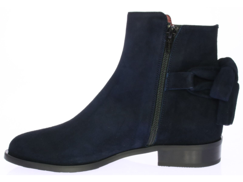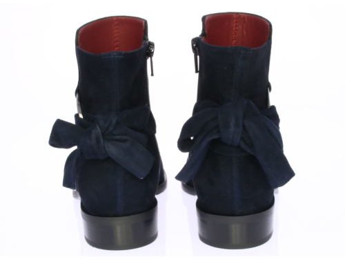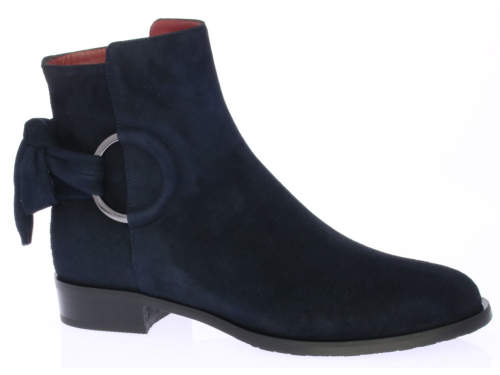 Blue suede women's ankle boot by Lilian. The boot has a leather lining and is finished with a metal ring and suede bow on the shaft.