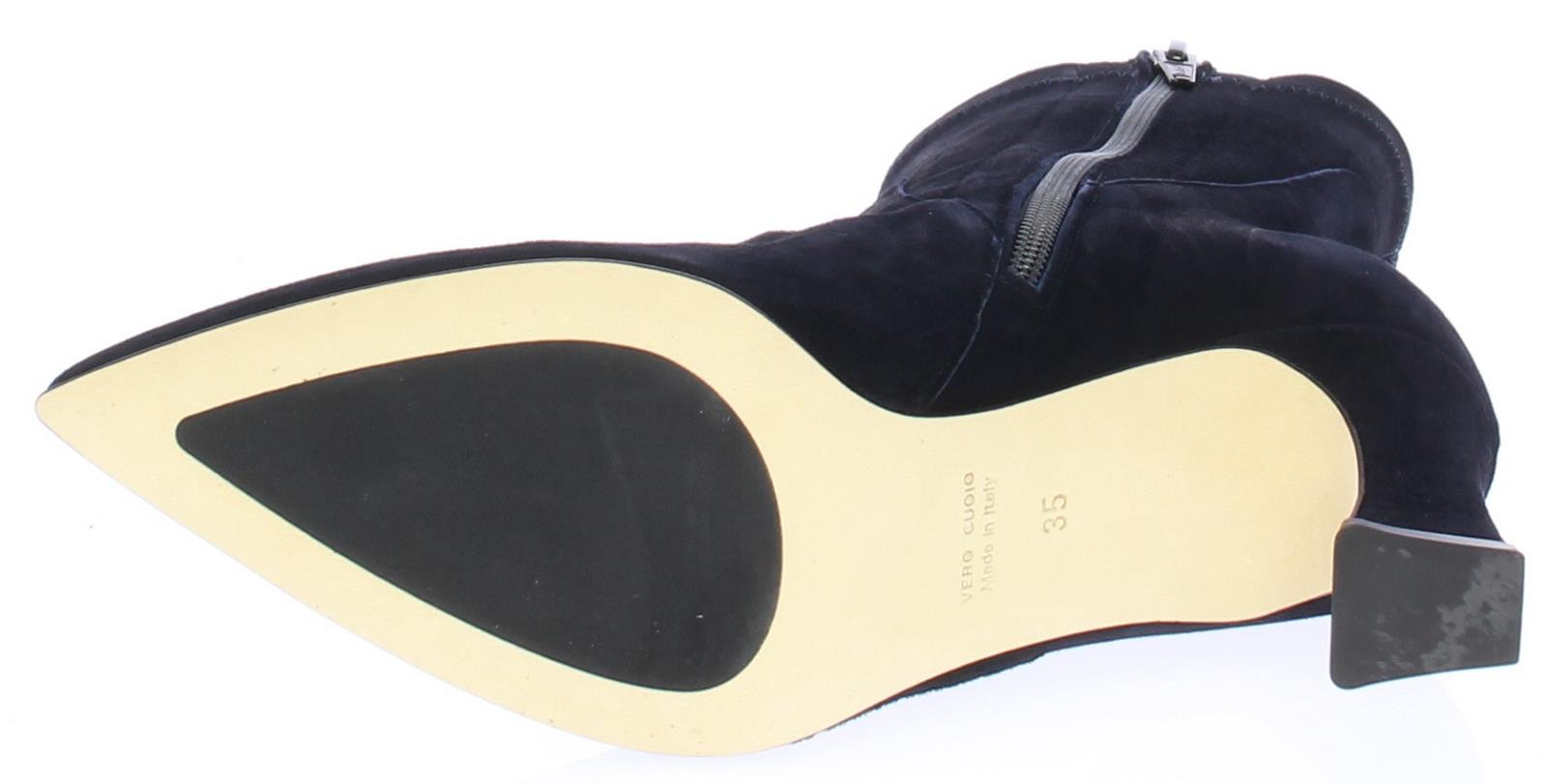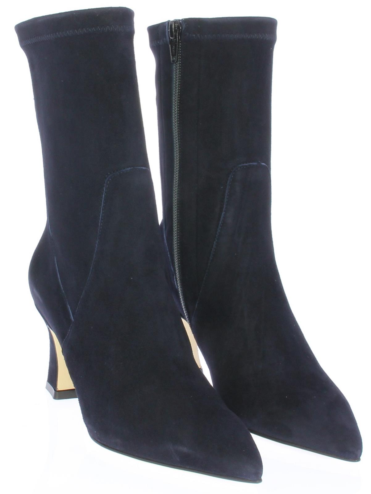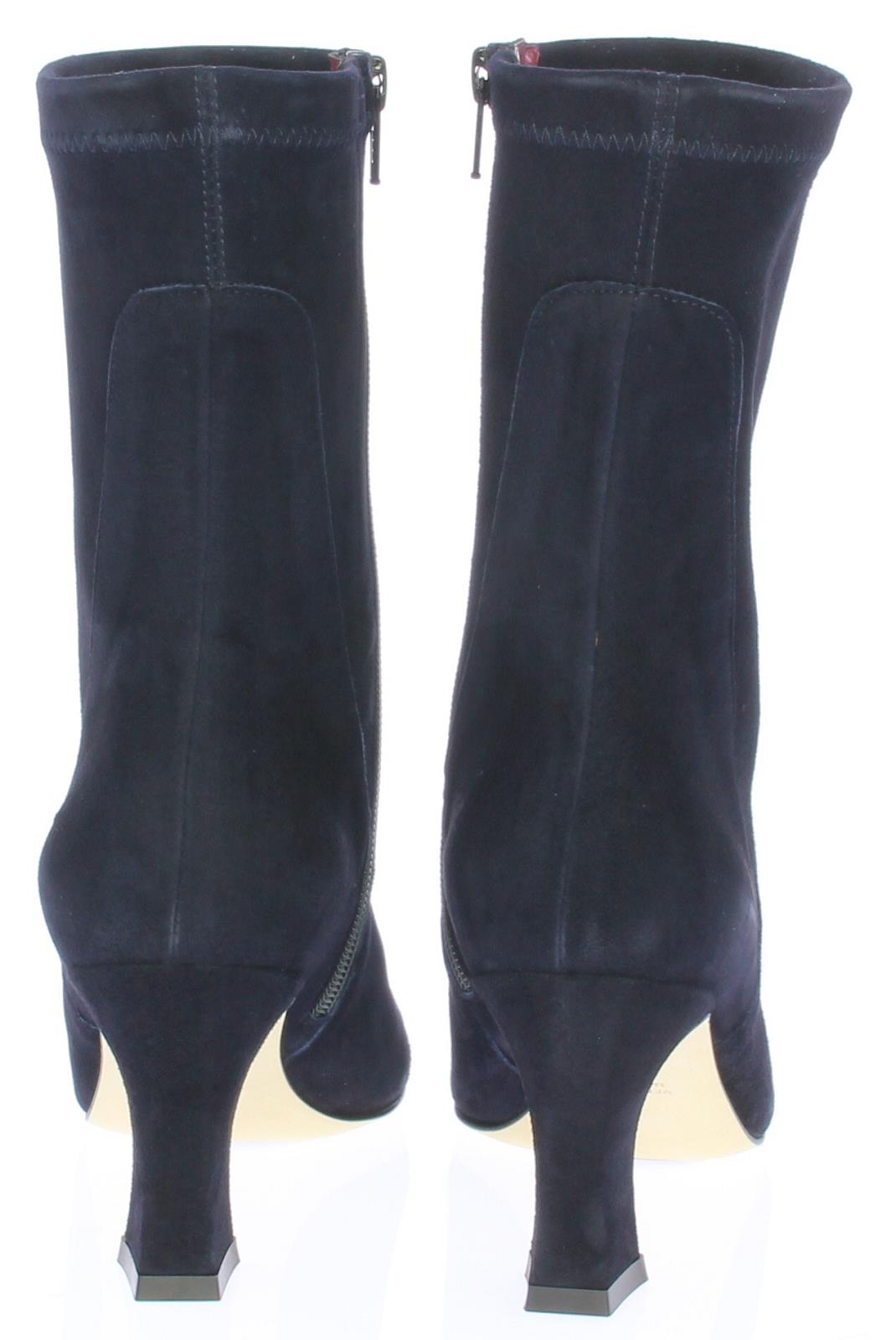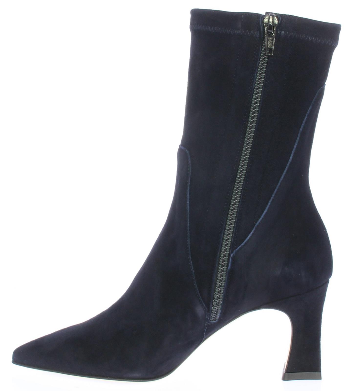 Dark blue suede three-quarter ladies ankle boot by Lilian. This boot has a pointed toe. The covered heel is slightly flared and has a height of 7 cm.