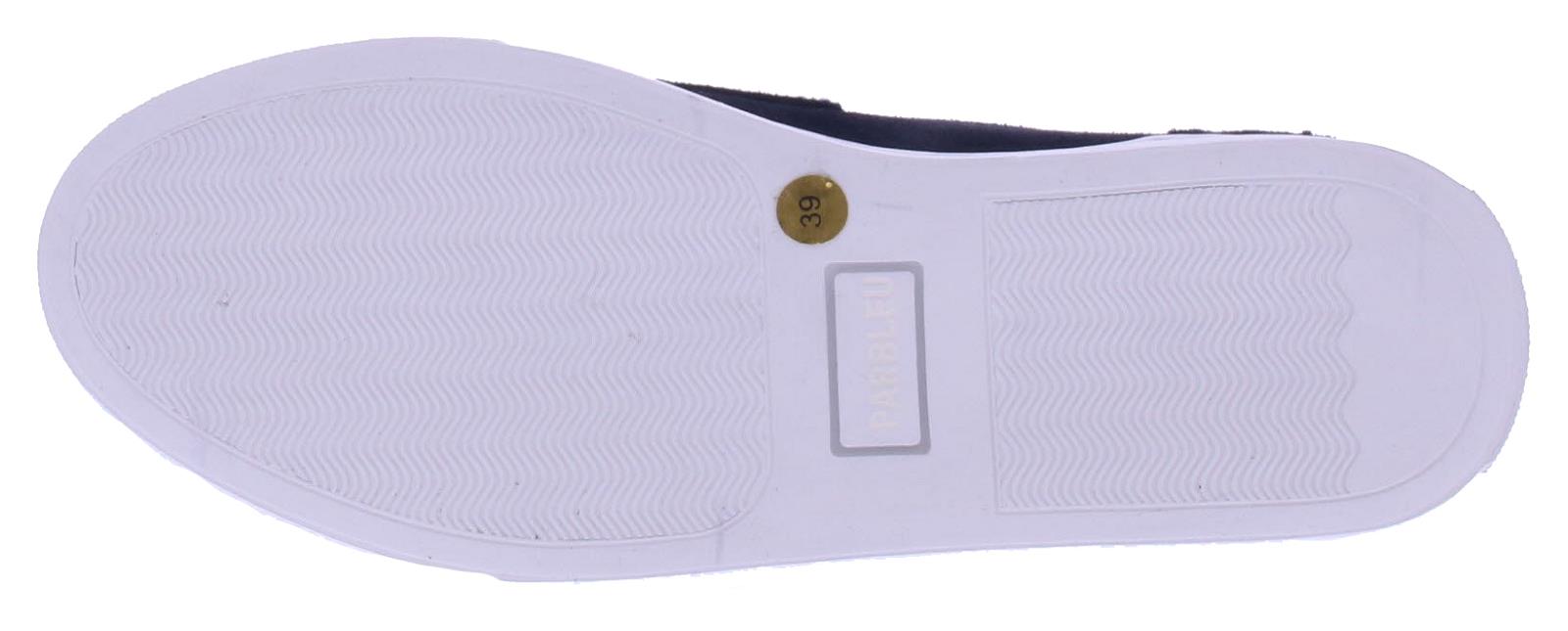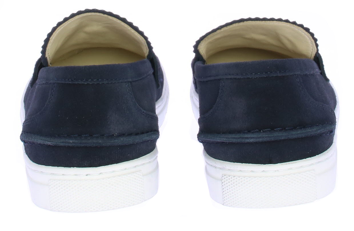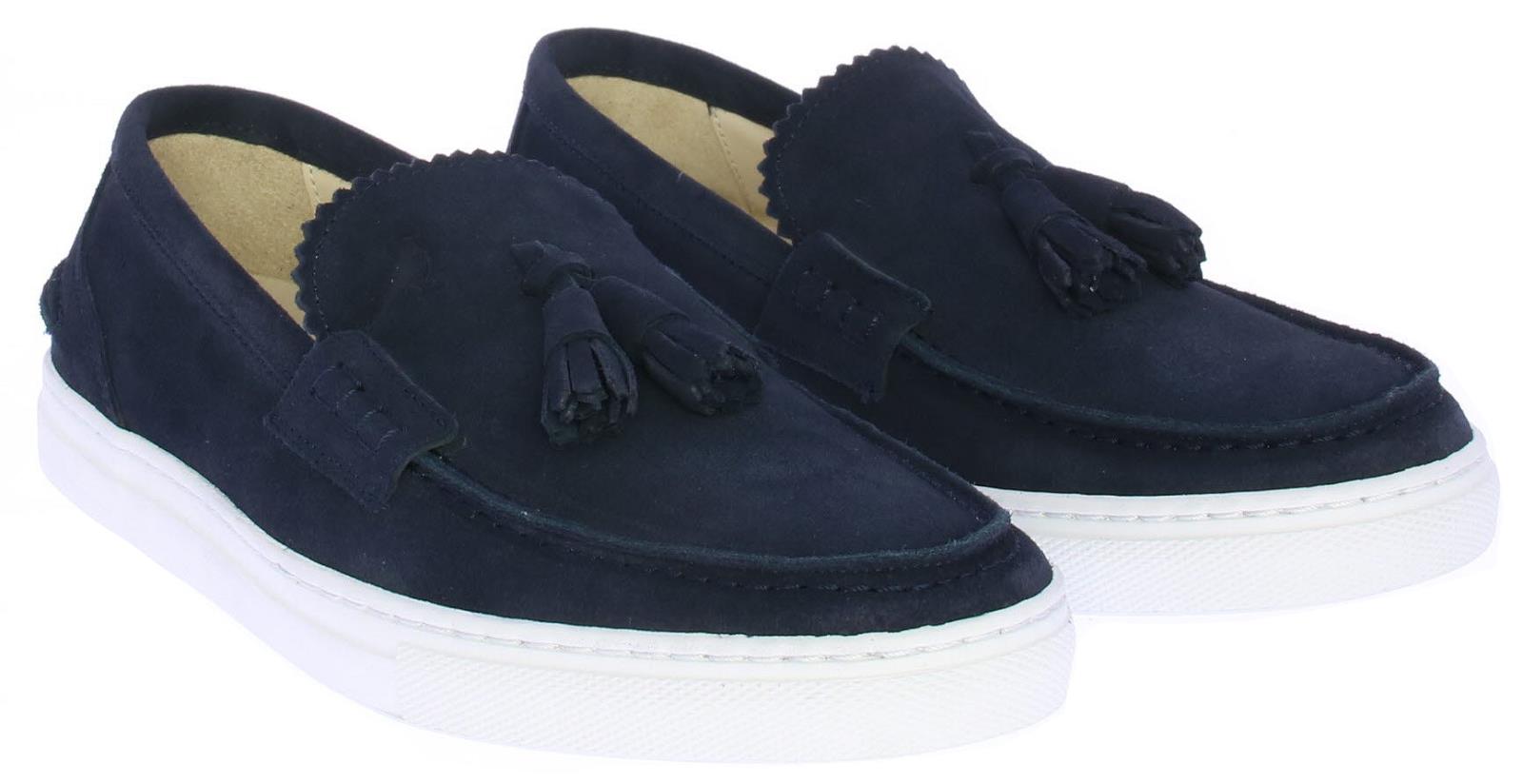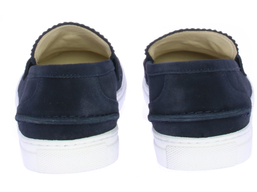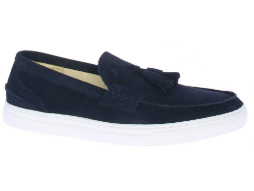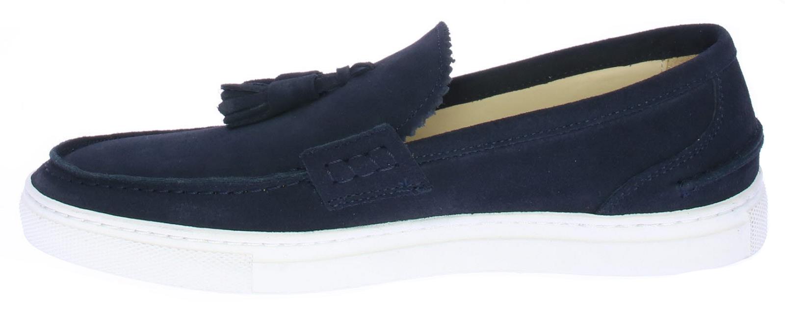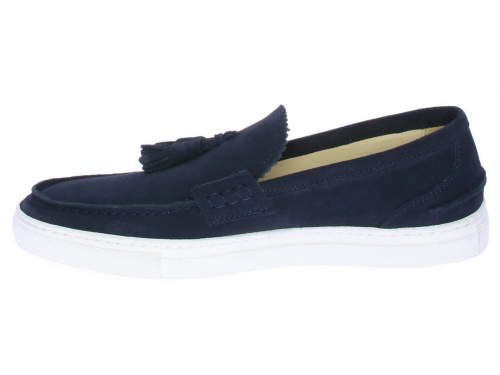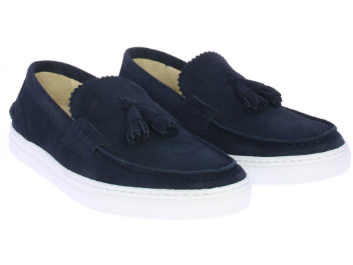 Dark blue suede men's loafer by Parbleu. This loafer is made with tassels on the vamp and comes on a sporty white rubber sole. The inner sole is removable.