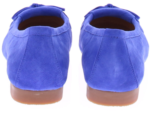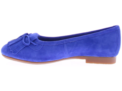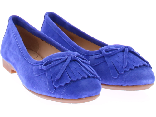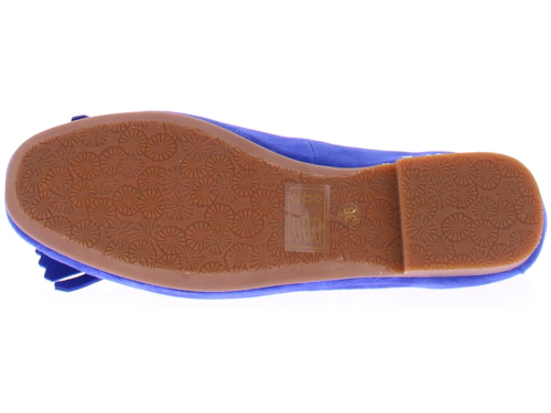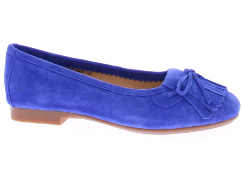 Cobalt blue suede women's ballerina by Di Lauro. This ballerina with round toe and fringes with bow on the forefoot is made of cobalt blue suede. The footbed is made of leather.