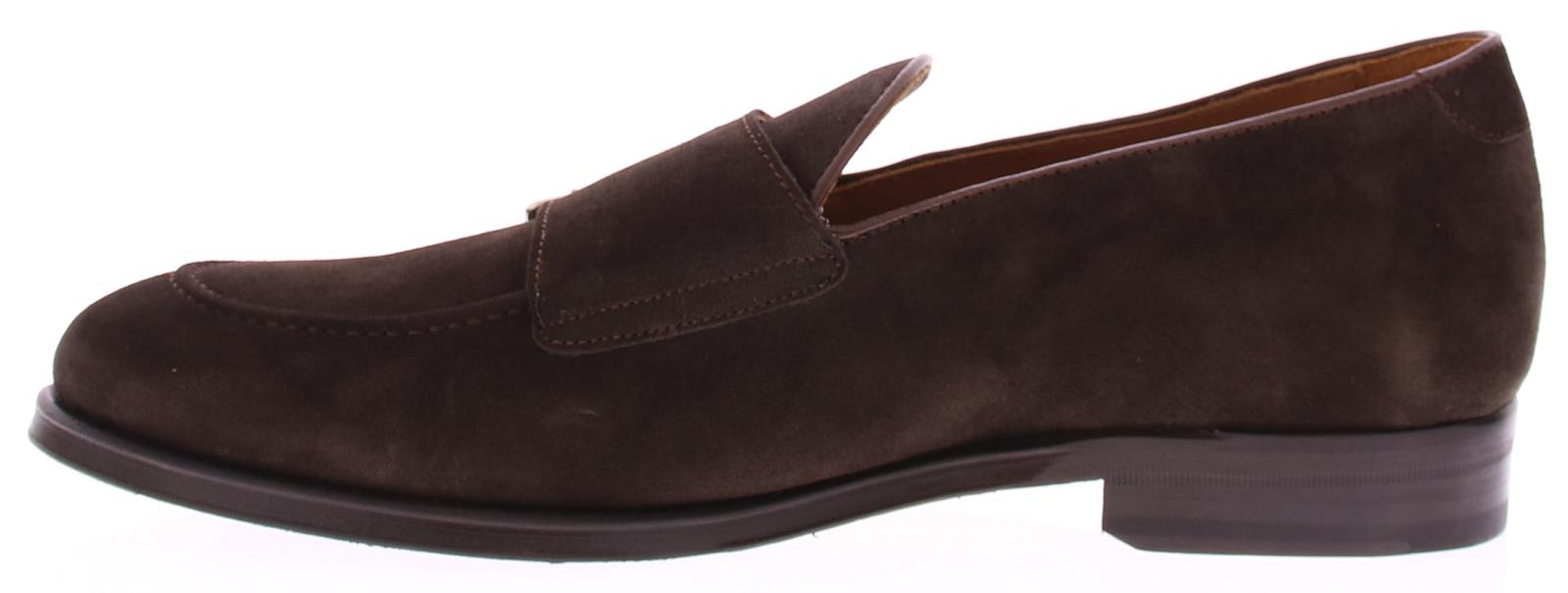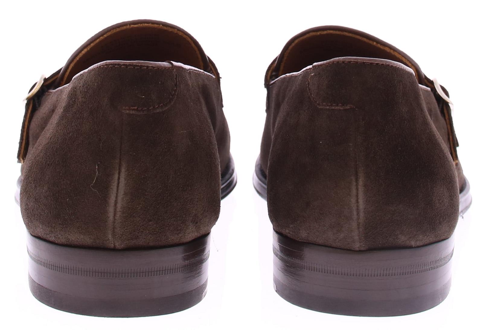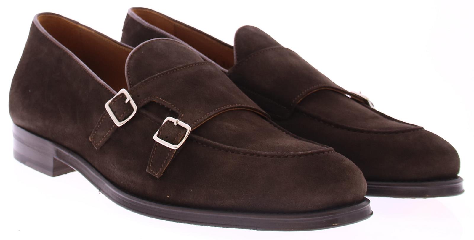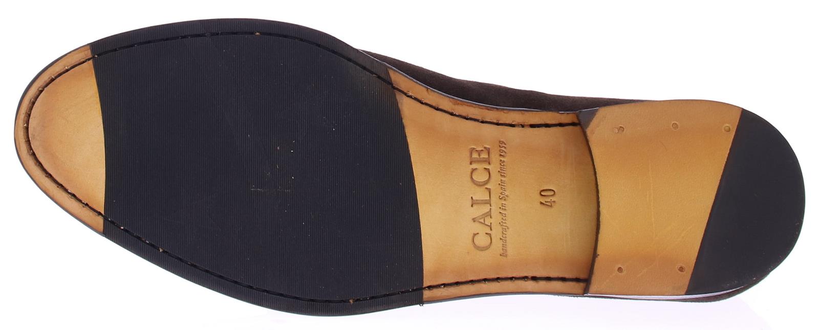 Men's loafer by Calce with a mirror seam on the toe and a double-buckle flap. The shoe is made of brown suede and features a leather sole with a rubber insert and a leather lining.