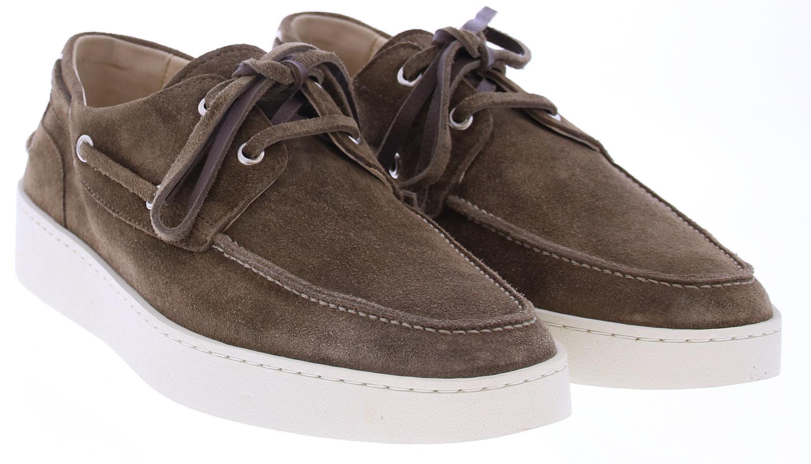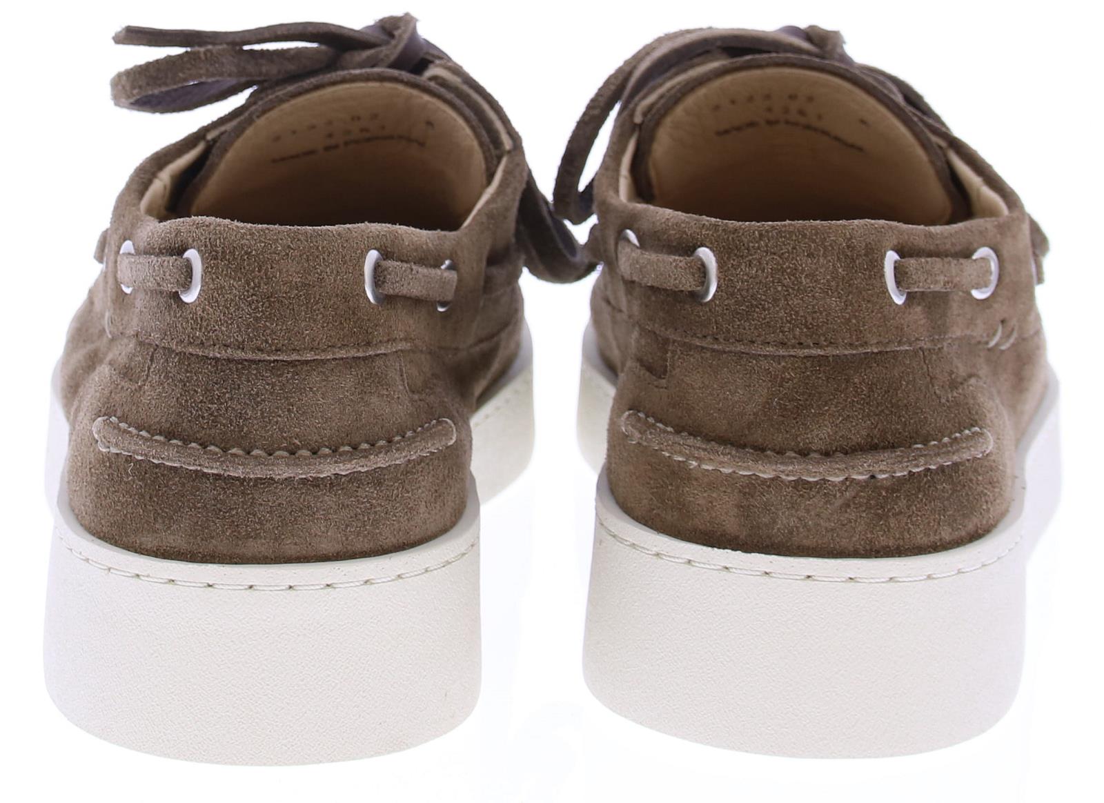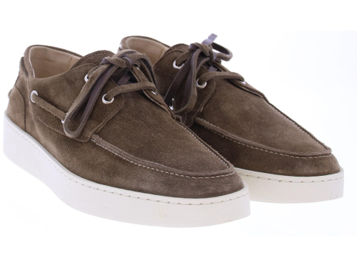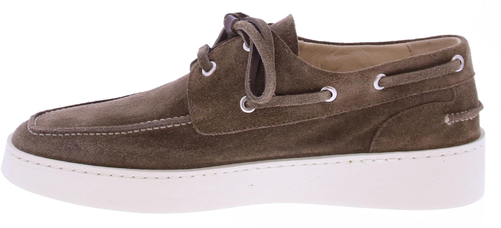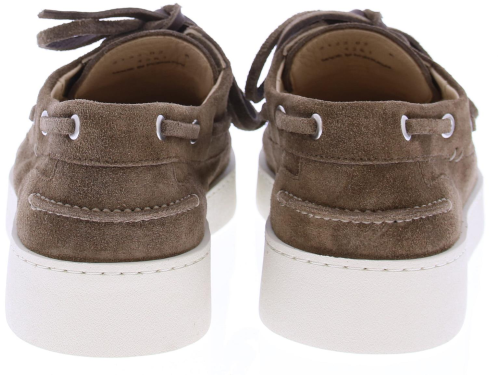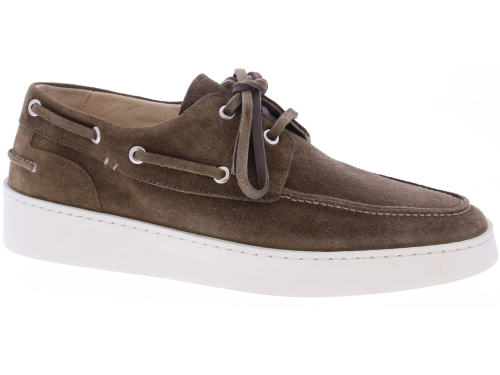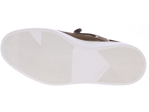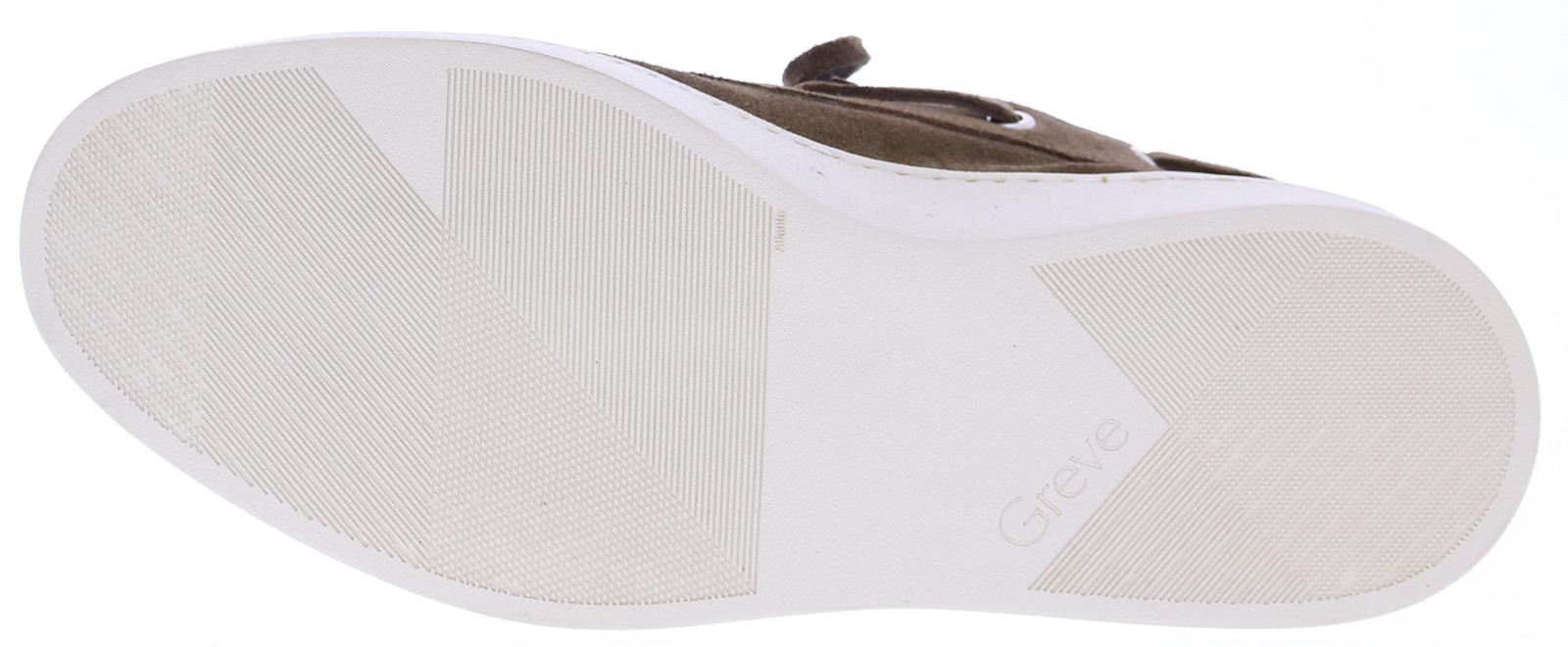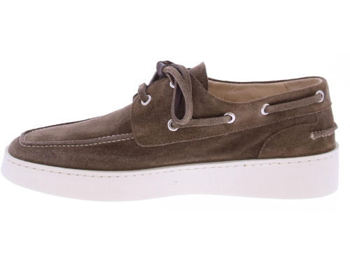 Brown suede men's boat shoe by Greve. This shoe has a leather lace and comes on a sporty white rubber sole.