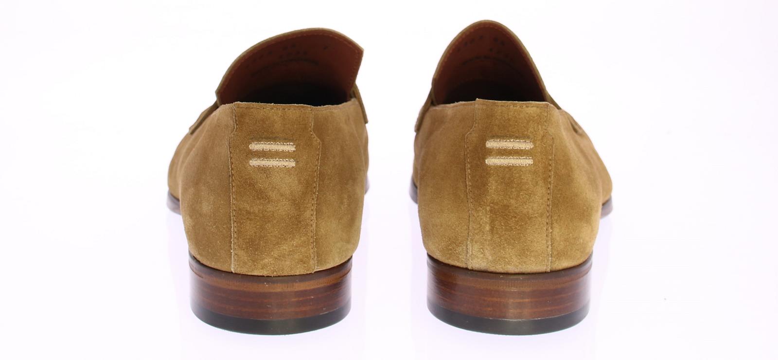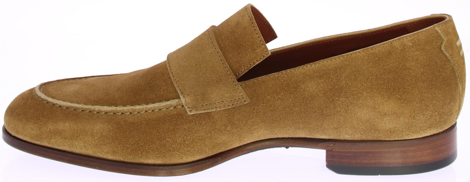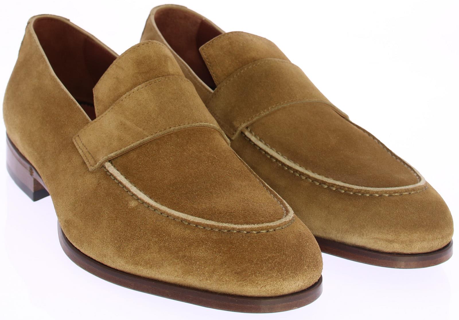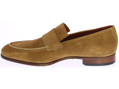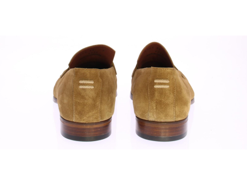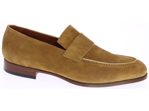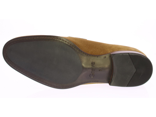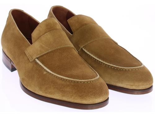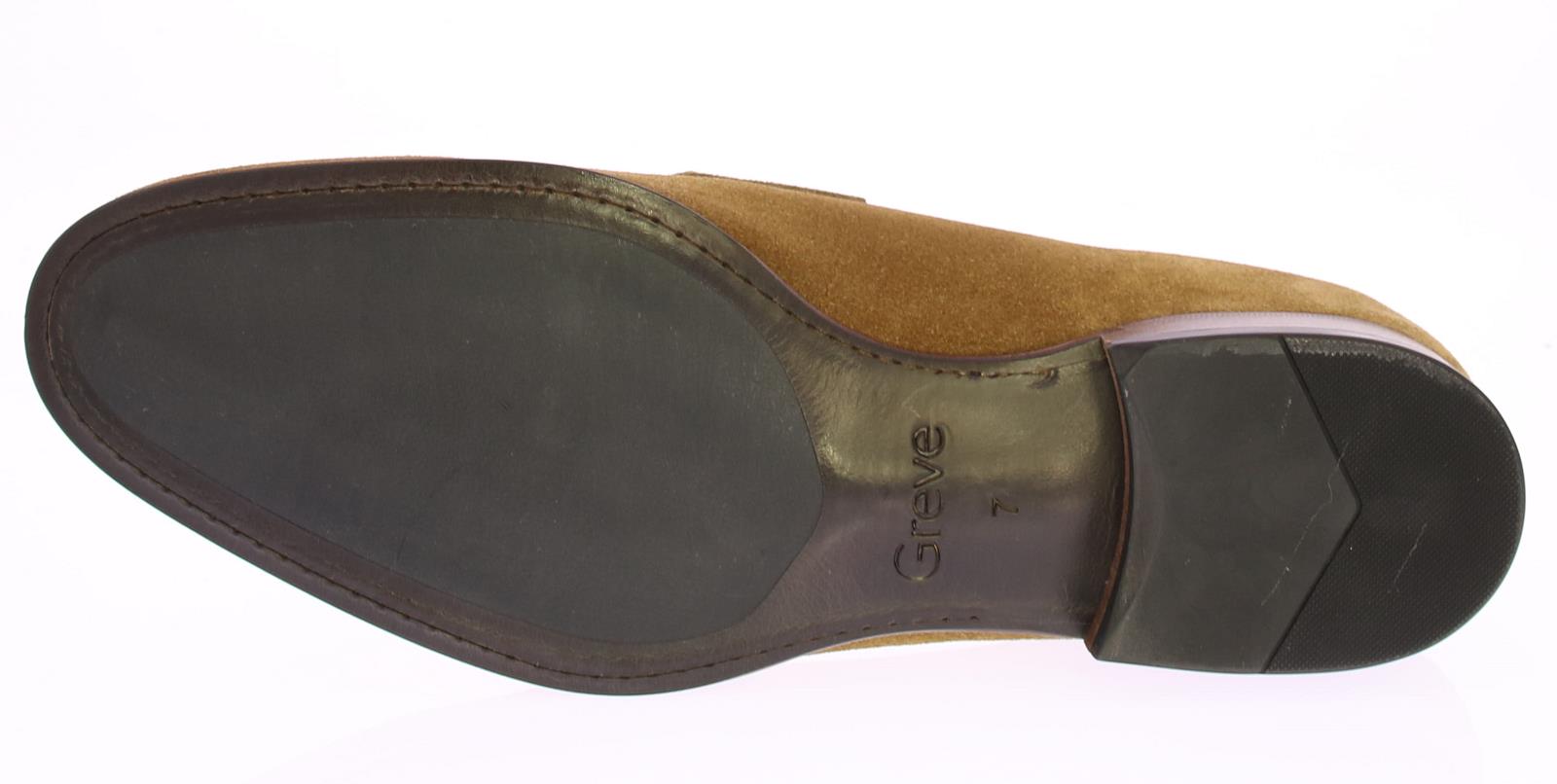Mid brown suede men's loafer by Greve. This loafer comes with a mirrored toe and has a leather sole with rubber insert.
