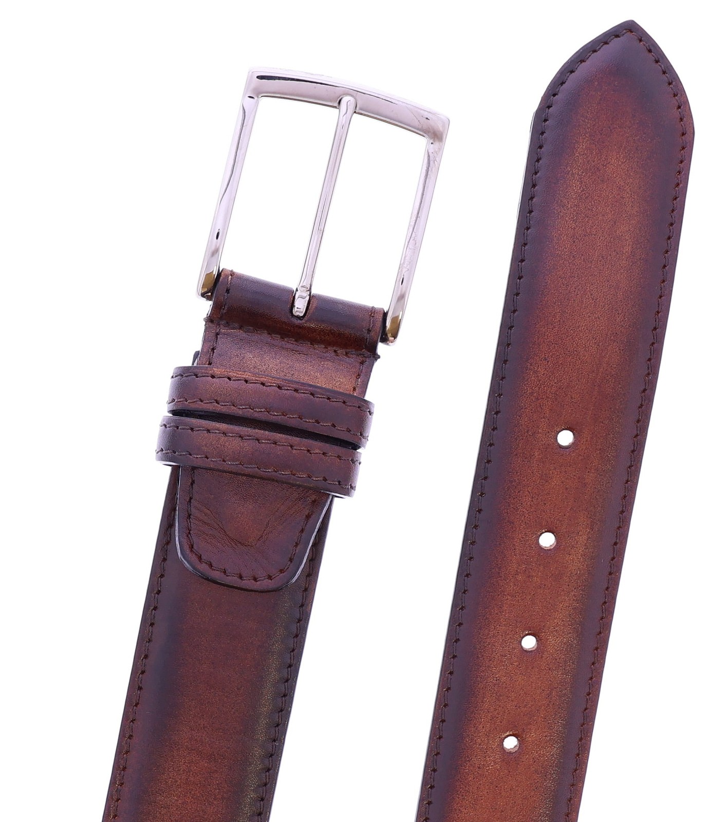 Brown leather men's belt by Harris. This belt matches perfectly with the brown sneakers with article number 44886. The belt is hand-finished. Thanks to the practical construction, the belt can be easily shortened at the buckle for a perfect fit.