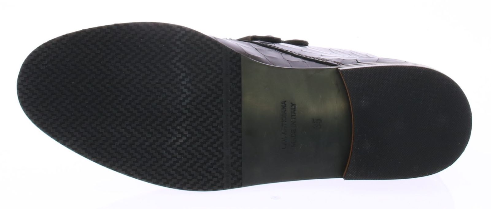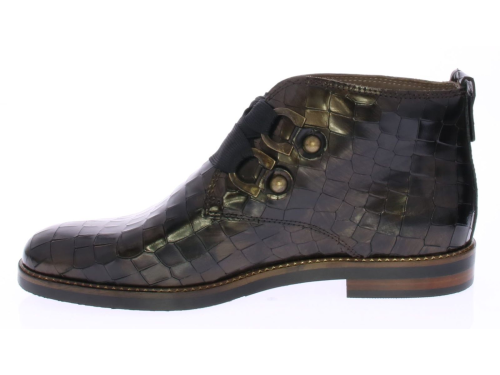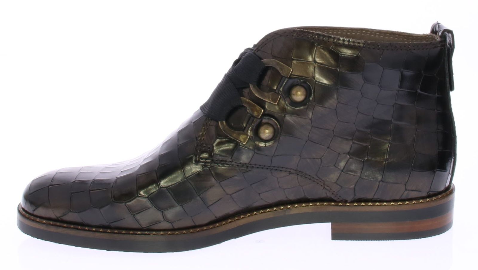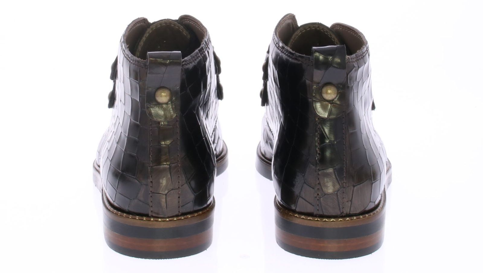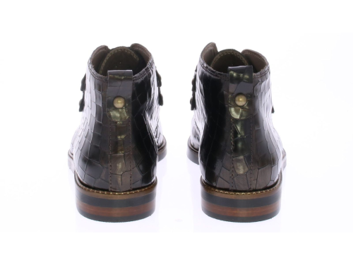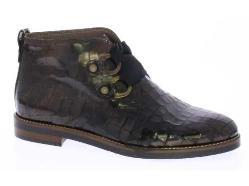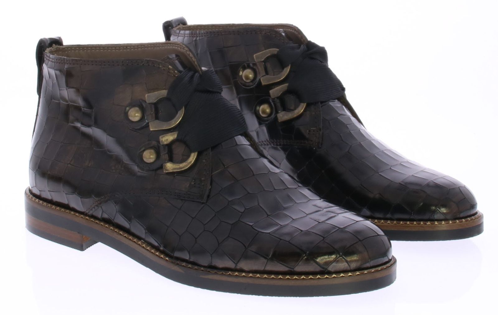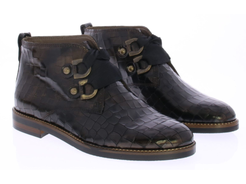 Ladies' ankle boot by Maripe in dark brown croc leather with a brushed effect. Finished with a playful, subtle decorative trim along the sole and cute eyelets with printed laces.